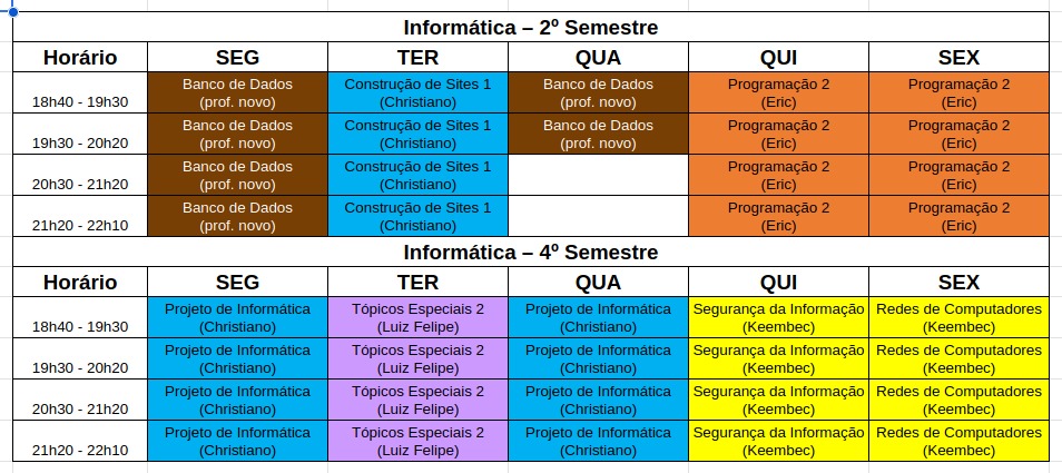 Horários Integrado Administração e Desenvolvimento de Sistemas 2026.2