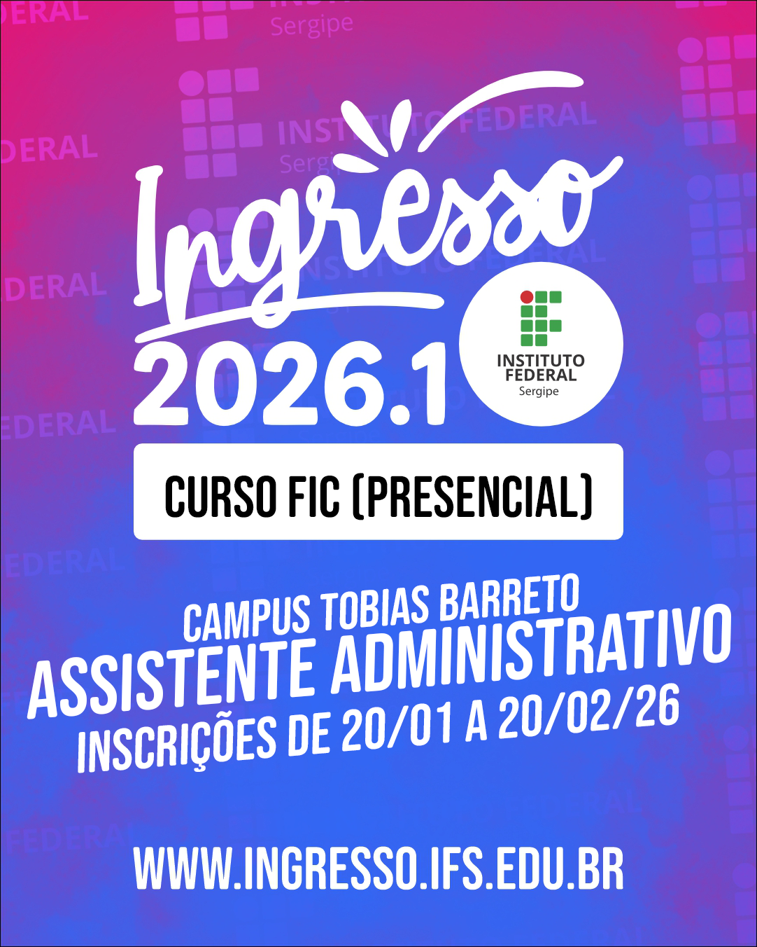 O Instituto Federal de Sergipe (IFS) – Campus Tobias Barreto -,  está com inscrições abertas para o Processo Seletivo 2025, oferecendo uma excelente oportunidade para estudantes que desejam cursar o ensino médio integrado à formação técnica. As inscrições podem ser realizadas até o dia 31 de dezembro de 2024. Para esta edição, o Campus Tobias Barreto disponibiliza 40 vagas para cada um dos seguintes cursos: Administração: Voltado para quem deseja desenvolver competências na gestão de negócios, planejamento e organização empresarial. Desenvolvimento de Sistemas: Ideal para aqueles interessados em tecnologia, com foco em programação, análise de sistemas e soluções digitais. Para participar do processo seletivo, as/os candidatos deverão realizar a inscrição pelo link: https://sigaa.ifs.edu.br/sigaa/public/vestibular/view.jsf?id=12150007 Não perca a oportunidade de dar um passo importante rumo ao seu futuro profissional. Aproveite para garantir sua vaga em um dos cursos oferecidos pelo IFS Campus Tobias Barreto. Vem ser IFS!! Para mais informações, acesse o site oficial ou entre em contato com o campus pelo whats (79) 3711-3288.