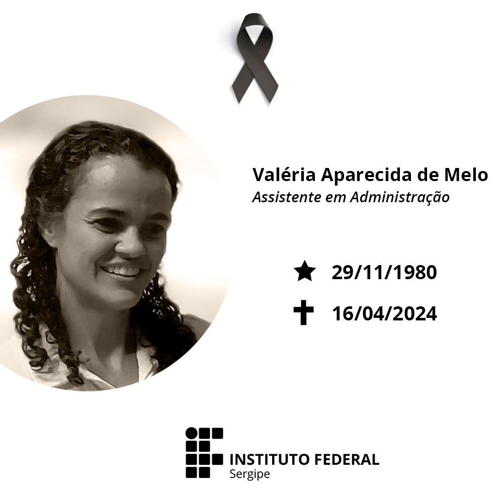 O Instituto Federal de Sergipe (IFS) comunica, com pesar, o falecimento da Assistente em Administração, Valéria Aparecida de Melo Ferreira Rodrigues. A servidora era oriunda do Instituto Federal do Amazonas (IFAM), mas estava lotada, por meio da modalidade de exercício provisório, na Pró-reitoria de Gestão de Pessoas (Progep) do IFS.