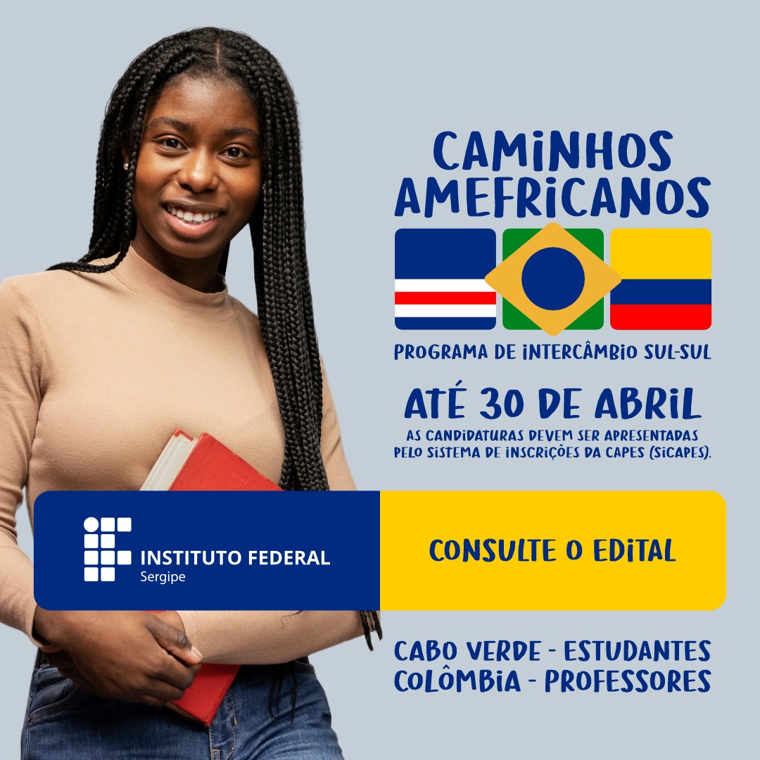 Estão abertas até o dia 30 de abril as inscrições para o segundo edital conjunto nº 1/2024 do Caminhos Amefricanos: Programa de Intercâmbios Sul-Sul. Nesta edição, serão selecionados estudantes para atividades em Cabo Verde e professores para ação formativa na Colômbia. As candidaturas devem ser apresentadas pelo Sistema de Inscrições da CAPES (Sicapes).