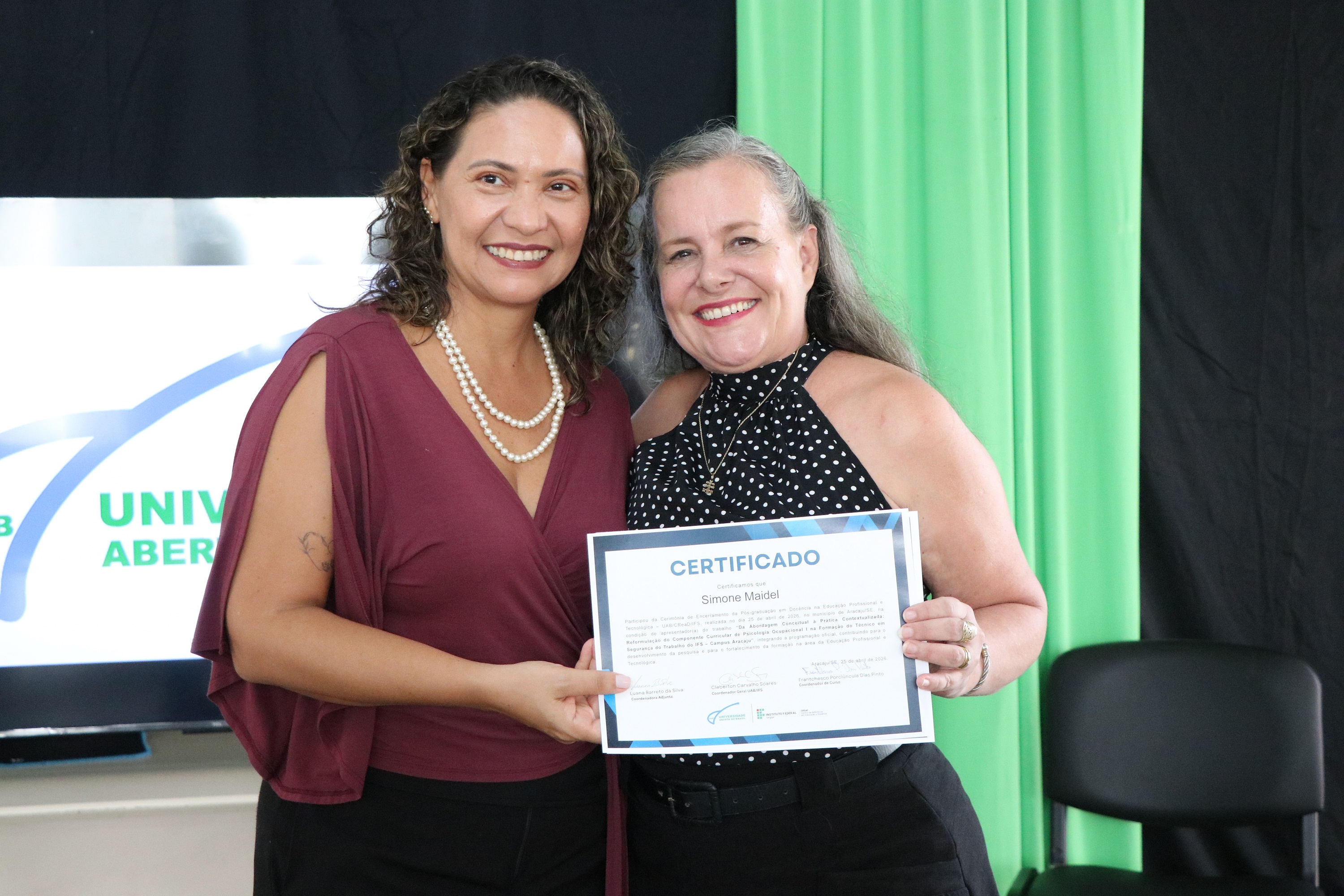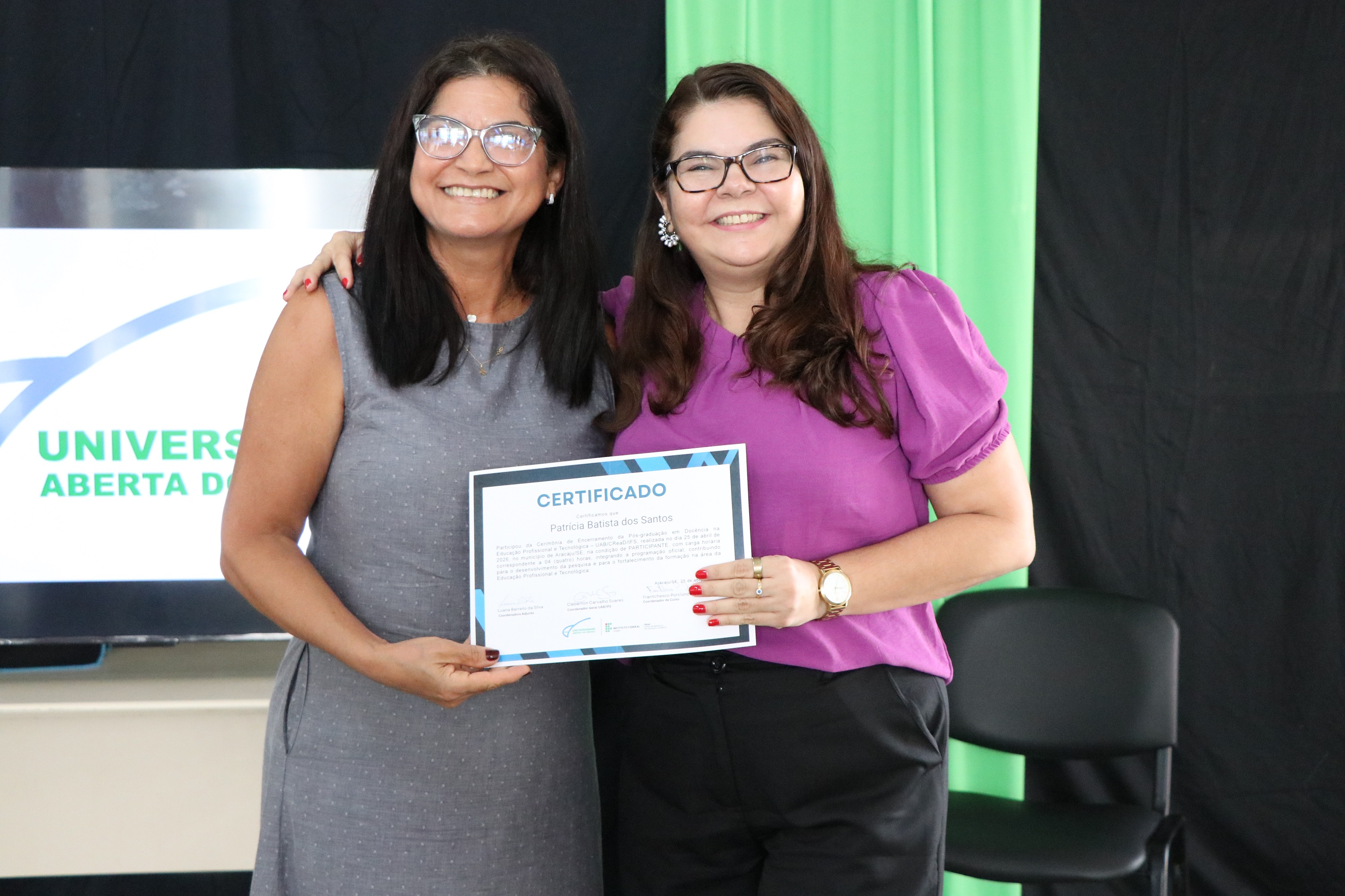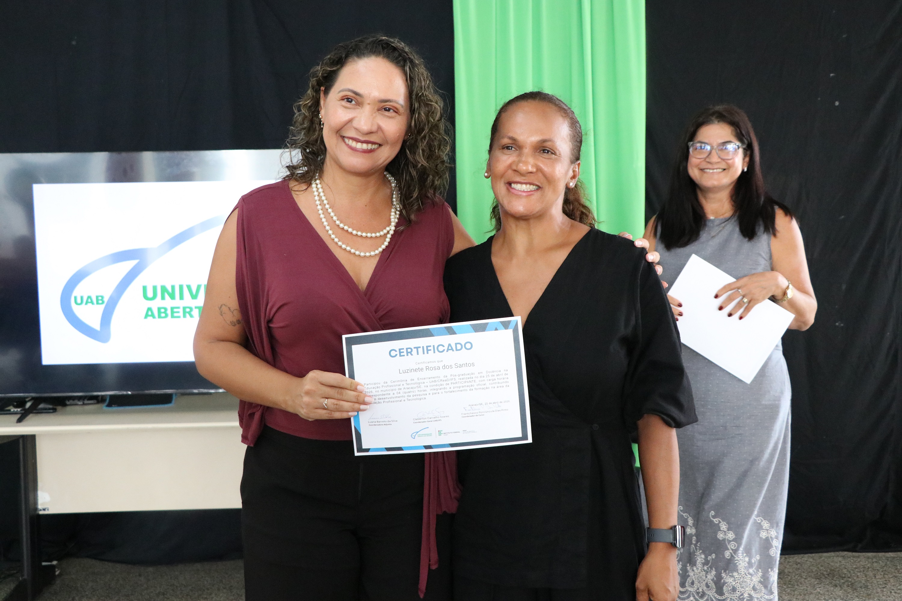 Confira na galeria abaixo outras fotos da formatura, que contou com a participação do professor José Osman dos Santos, pró-reitor de Pesquisa e Extensão; da representante dos polos UAB em Sergipe, Urandy Rocha dos Santos; do coordenador geral da UAB, professor Cleberton Soares; da coordenadora adjunta da UAB, Luana Barreto; da professora Valéria Oliveira, chefe titular do CREaD/IFS; e dos professores Sônia Melo e Jairton Mendonça, diretores-gerais dos campi Estância e Itabaiana, respectivamente.