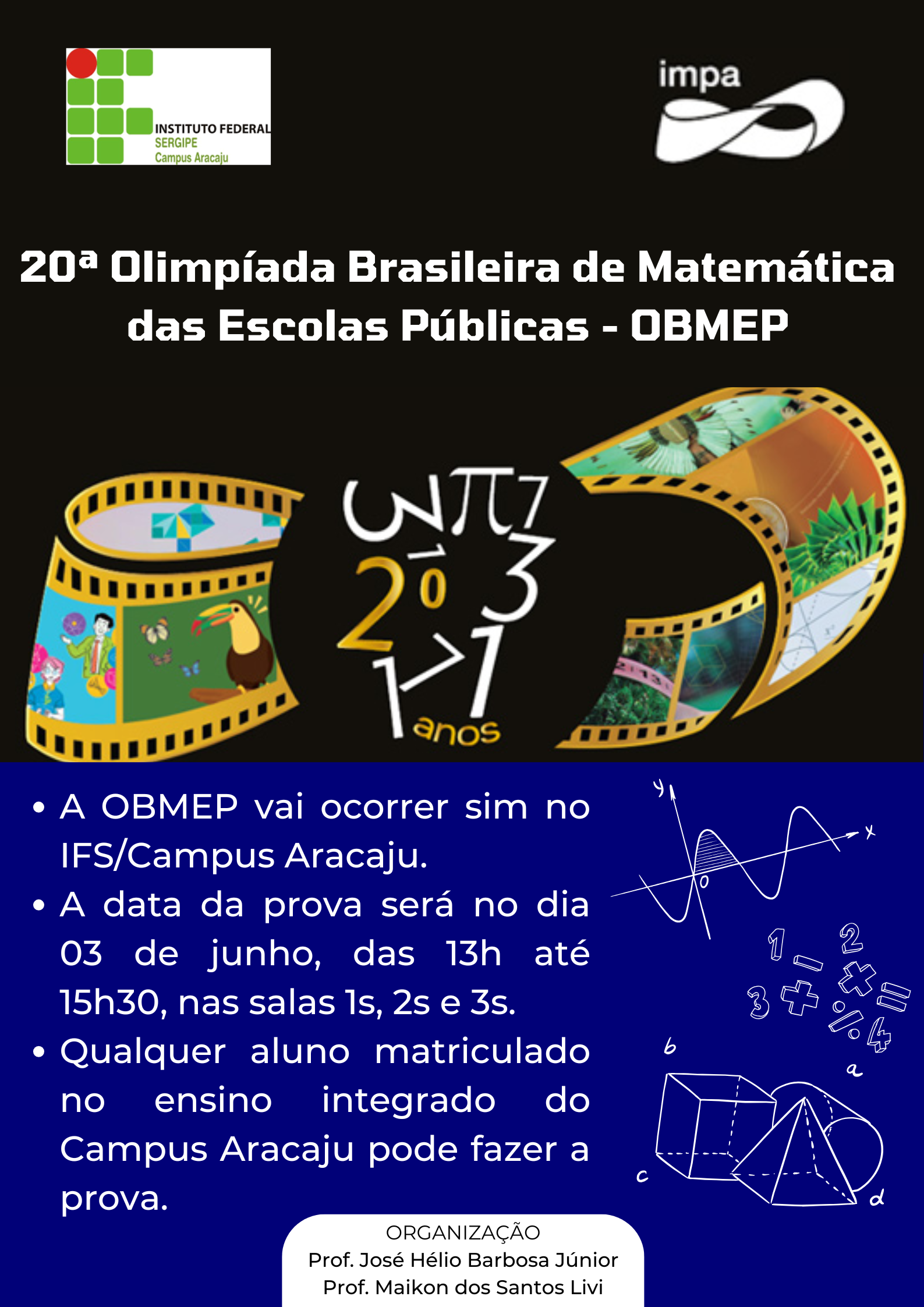 Todos os estudantes dos seis cursos técnicos, integrado ao ensino médio, do campus Aracaju do Instituto Federal de Sergipe estão inscritos na primeira fase da Olimpíada Brasileira de Matemática das Escolas Públicas (OBMEP 2025) e terão a oportunidade de testar seus conhecimentos na prova que ocorrerá no dia 03 de junho, das 13h até 15h30, nas salas 1s, 2s e 3s do IFS Aracaju. Para participar, basta o aluno comparecer ao local no dia e horário determinados. A competição é gratuita.