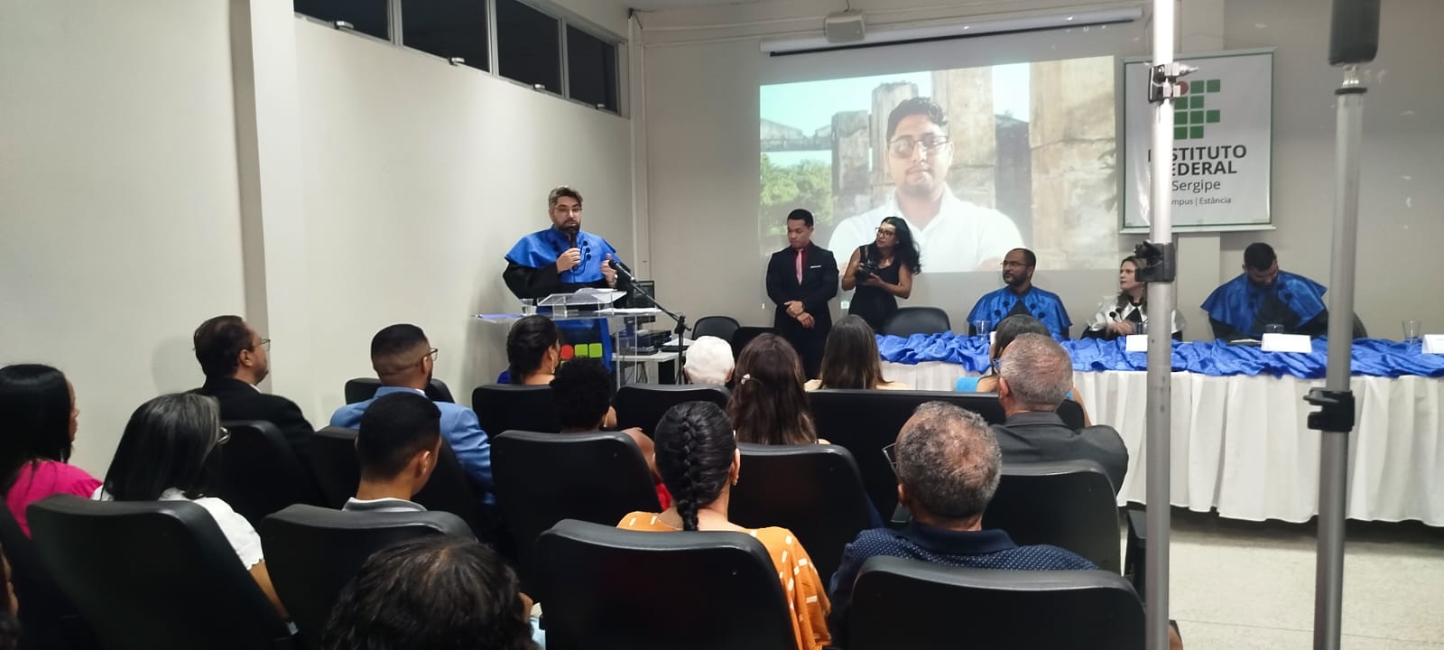 Fizeram parte da mesa o pró-reitor de Ensino, Alysson Santos Barreto, que representou a reitora do IFS, Ruth Sales Gama de Andrade; a diretora-geral do Campus Estância, Sônia Pinto de Albuquerque Melo; o paraninfo e coordenador do curso, professor Thiago Augustus Remacre Munareto Lima, e o patrono, professor Gilberto Messias Júnior.
