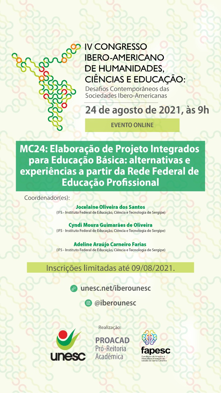 A experiência de projetos integradores no Instituto Federal de Sergipe (IFS) será abordada no IV Congresso Ibero-Americano de Humanidades, Ciências e Educação, evento internacional realizado de 23 a 27 de agosto no formato online. Esta edição pautará os “Desafios Contemporâneos das Sociedades Ibero-Americanas: espaço cultural e geográfico que vivencia questões comuns que possibilitam análises compartilhadas e ações solidárias.
