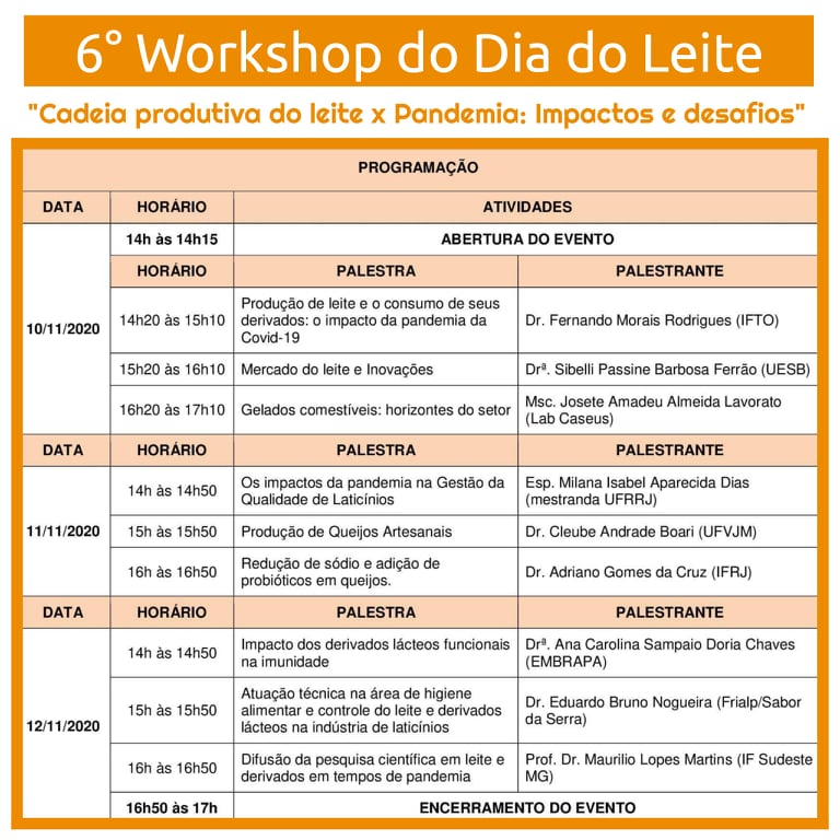 A programação do evento foi cuidadosa pensada pela comissão organizadora com palestras alinhadas ao tema “Cadeia produtiva do Leite x Pandemia: Impactos e Desafios” e contará com palestrantes de diversas empresas e instituições do país, como Embrapa, Instituto Federal do Tocantins, Instituto Federal do Rio de Janeiro, Universidade Estadual do Sudoeste da Bahia, entre outras.
