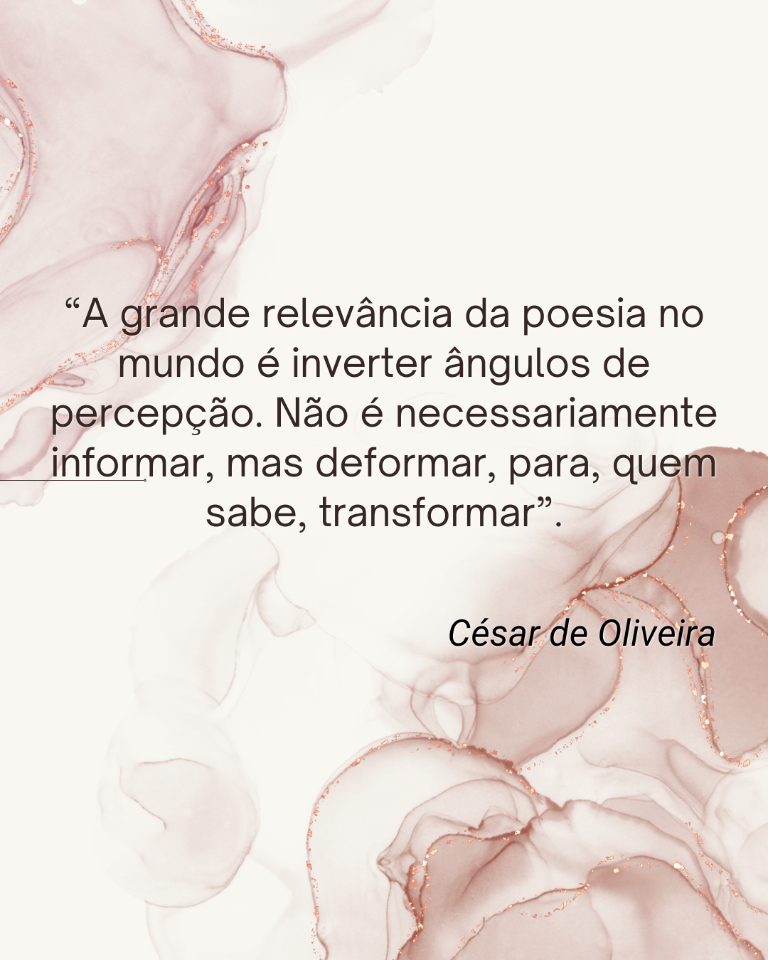 Como deu pra perceber, na poesia não há definições fechadas e, portanto, sua importância para o mundo não é diferente, segue a mesma tendência subjetiva e pessoal. Para César de Oliveira, “a grande relevância da poesia no mundo é inverter ângulos de percepção. Não é necessariamente informar, mas deformar, para, quem sabe, transformar. A poesia é essencial para mim porque funciona como um catalisador de percepções”, revelou.