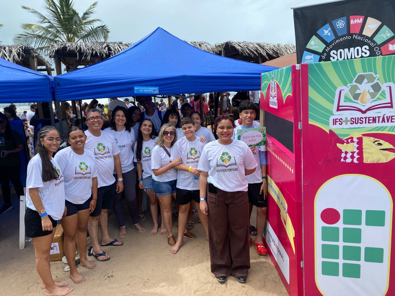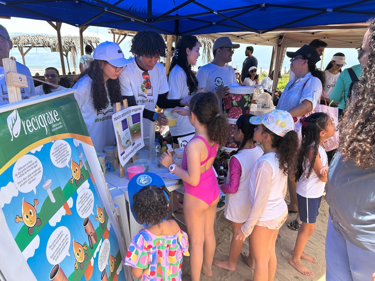 O trabalho, no entanto, foi além da coleta. Os estudantes levaram para a praia um conjunto de práticas de educação ambiental construídas dentro dos projetos CompostIFS e Reciclagem de Óleo de Cozinha. Entre as atividades, estavam oficinas de saboaria artesanal, demonstrando como resíduos orgânicos podem ser reaproveitados, além da compostagem doméstica. Para atrair famílias e crianças, o grupo encenou um teatro de fantoches que abordava os impactos do descarte de óleo de cozinha nas redes de esgoto e no meio ambiente. O encontro entre ciência, arte e prática cotidiana transformou o evento em um espaço de sensibilização coletiva, no qual cada espectador saía com um aprendizado aplicável em casa.