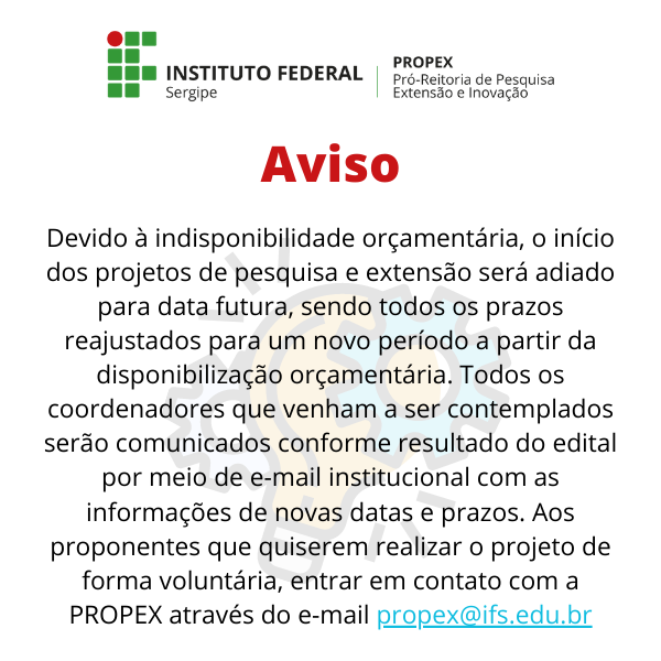 O Instituto Federal de Educação, Ciência e Tecnologia de Sergipe – IFS, através da Pró-Reitoria de Pesquisa e Extensão – PROPEX, torna público o processo seletivo de propostas de projetos de pesquisa, com o fim de compor cadastro de reserva, para a concessão de auxílio financeiro e bolsas, a alunos regularmente matriculados no eixo de ‘Pesquisa Aplicada’, para o Programa Mulher, Gênero e Feminismo na Ciência – Mulher na Ciência de acordo com as disposições deste Edital.