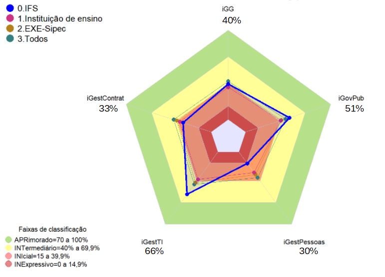 A Figura 1 apresenta apresentados os valores do iGG (índice integrado de governança e gestão públicas), iGovPub (índice de governança pública) e os índices de capacidade em Gestão de Pessoas, Gestão de TI e em Gestão de Contratações do órgão, comparados às médias obtidas pelas organizações do mesmo tipo, segmento e com todas as organizações participantes.