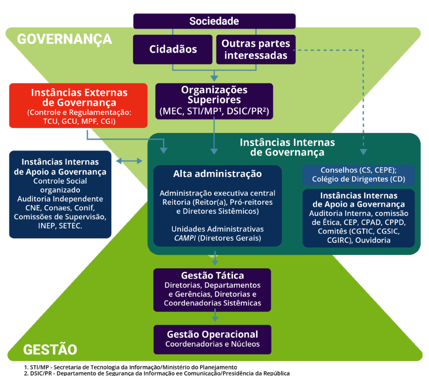 O Sistema de Governança Corporativa do IFS, instituído por meio da Deliberação nº 03/2018/CGIRC/IFS de 13/06/2018, que estabelece o modelo de governança do órgão por meio das instâncias que o compõem. Integram o sistema, no âmbito interno, instâncias de governança e de apoio à governança e as áreas de gestão em nível estratégico (equivalente à Alta Administração do órgão), tático e operacional do órgão.