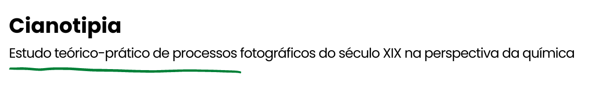 O presente projeto visa estudar de forma teórica, prática e interdisciplinar os processos envolvidos na obtenção de imagens através da cianotipia. Os estudantes envolvidos serão capazes de reconhecer a técnica, otimizar a qualidade das imagens obtidas em diferentes tipos de papéis através do estudo da química por trás da cianotipia e propagar esse conhecimento através do desenvolvimento de palestras e cursos para toda a comunidade. A cianotipia é um processo de impressão fotográfica em tons de azuis, que produz uma imagem ciano. A técnica foi empregada nos séculos XIX e XX principalmente como um processo de baixo custo para copiar desenhos e diagramas. O cianótipo usa basicamente dois compostos químicos: de citrato ou oxalato férrico amoniacal. O efeito resultante depende da exposição à luz ultravioleta (luz negra e luz solar), que provoca mudanças no composto final (complexo metálico conhecido como azul da Prússia).