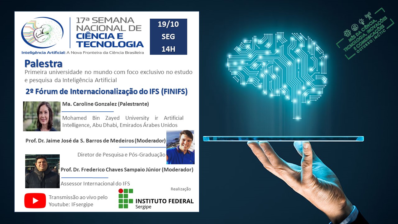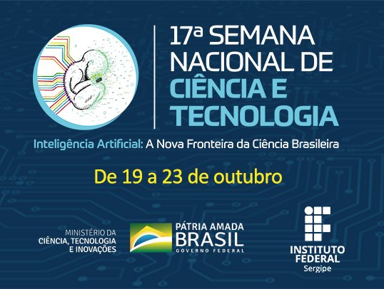 “Inteligência Artificial: A Nova Fronteira da Ciência Brasileira” foi o tema escolhido para a décima sétima edição da Semana Nacional de Ciência e Tecnologia (SNCT) em 2020, que ocorrerá entre os dias 19 e 23 de outubro no IFS. Vislumbra-se que a IA pode trazer ganhos na promoção da competitividade e no aumento da produtividade brasileira, na prestação de serviços públicos, na melhoria da qualidade de vida das pessoas e na redução das desigualdades sociais, dentre outros.