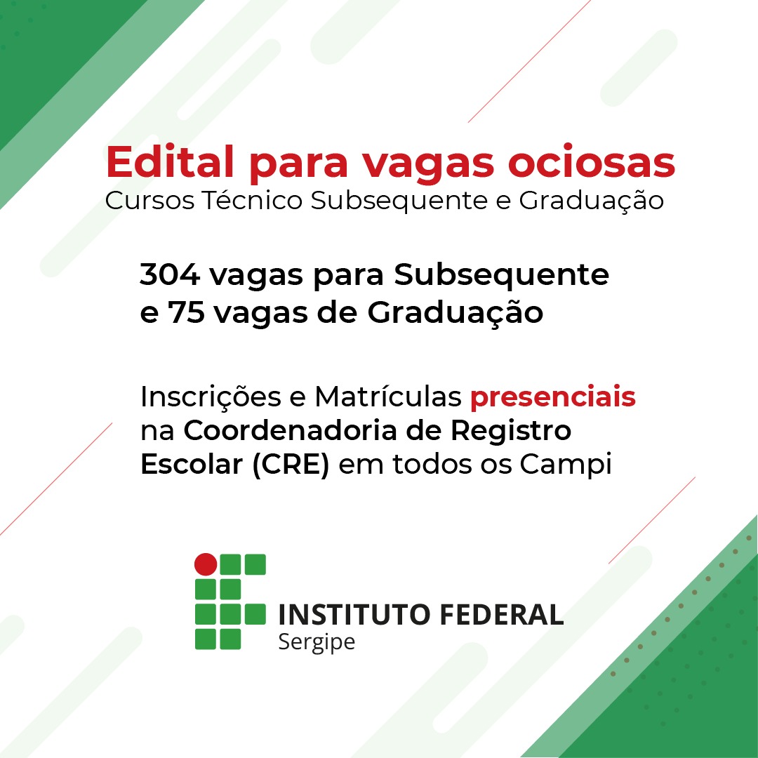 O Departamento de Gestão de Ingresso (DGI), do Instituto Federal de Sergipe (IFS), traz mais uma oportunidade para aqueles que desejam fazer parte de uma das instituições mais respeitadas do ensino sergipano. Afinal, nesta quarta, 03, foram lançadas duas chamadas públicas com a publicação de editais para preenchimento de vagas ociosas em cursos técnicos subsequentes (destinados a pessoas que já terminaram o ensino médio e querem fazer um técnico) e em cursos de graduação.