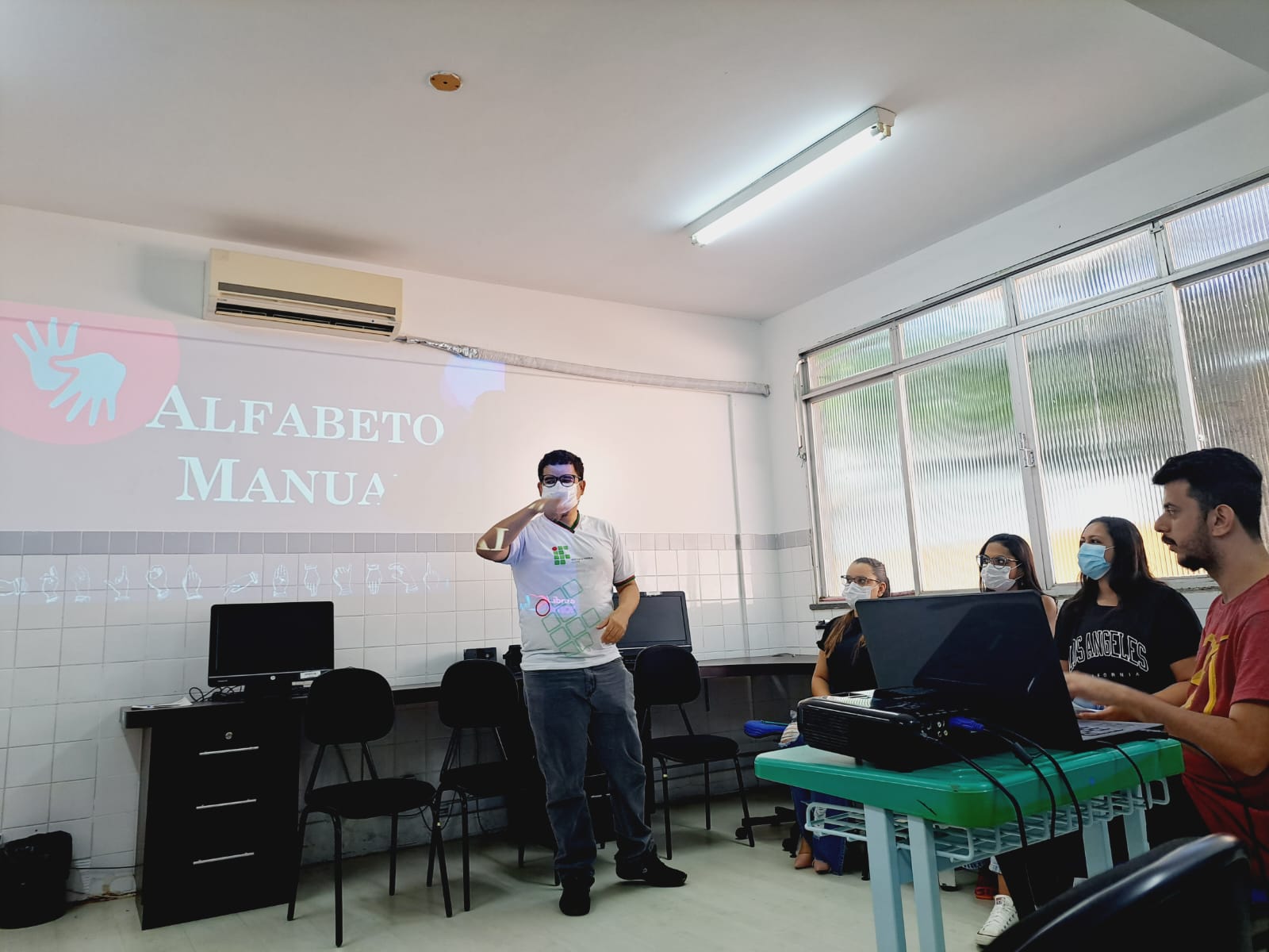 A outra oficina foi de Introdução à Libras, realizada por Bruna Santos, tradutora e intérprete de Libras do Campus Socorro, e por Guilherme Tenório, estudante do curso técnico em Suporte e manutenção de informática no mesmo campus. Além do momento de ensino de sinais básicos, os participantes foram incentivados a praticar.