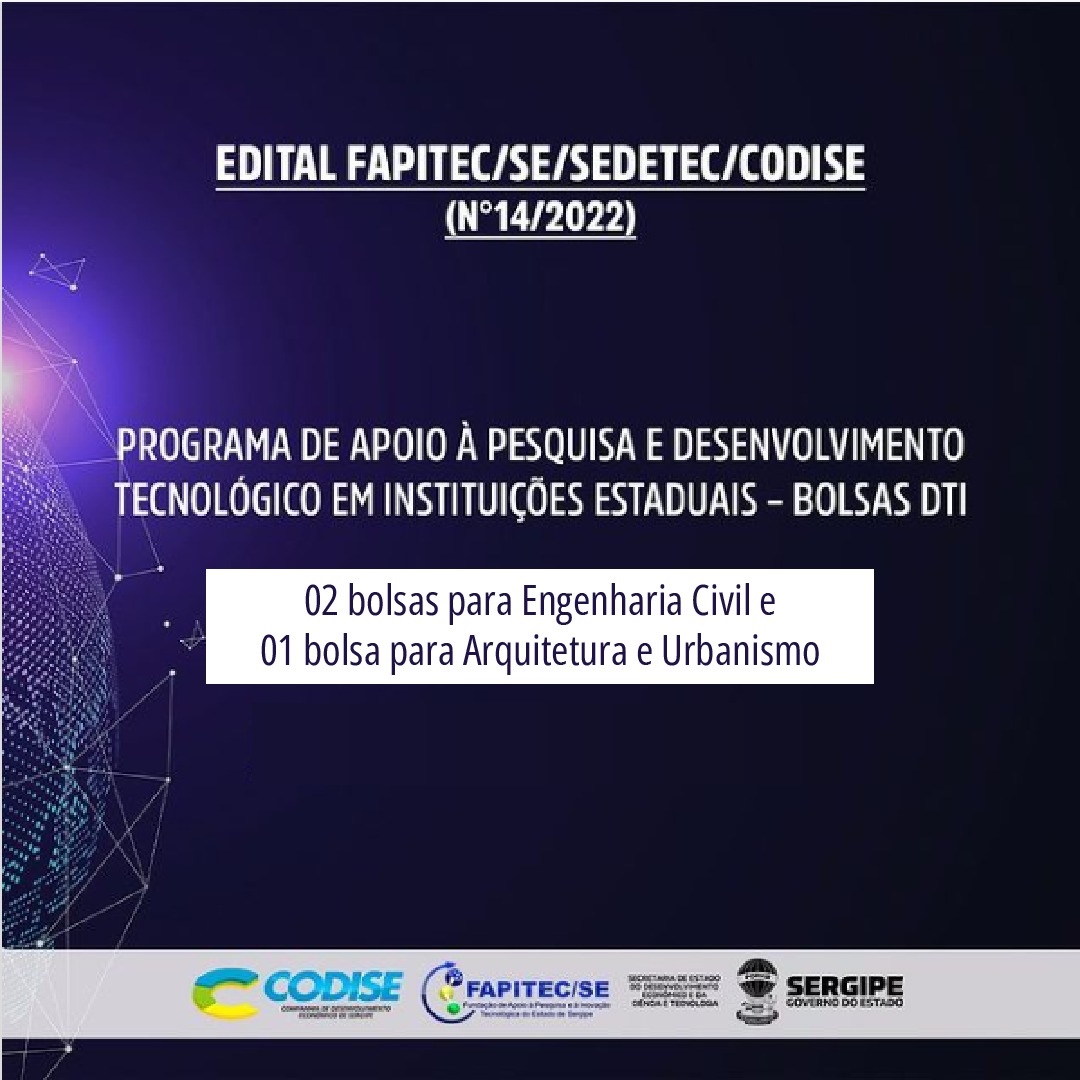 A Fundação de Apoio à Pesquisa e à Inovação Tecnológica do Estado de Sergipe (Fapitec/SE) está com as inscrições abertas, até 16 de março, para o Edital Fapitec/Codise nº 14/2022 (Programa de Apoio à Pesquisa e Desenvolvimento Tecnológico em instituições estaduais).