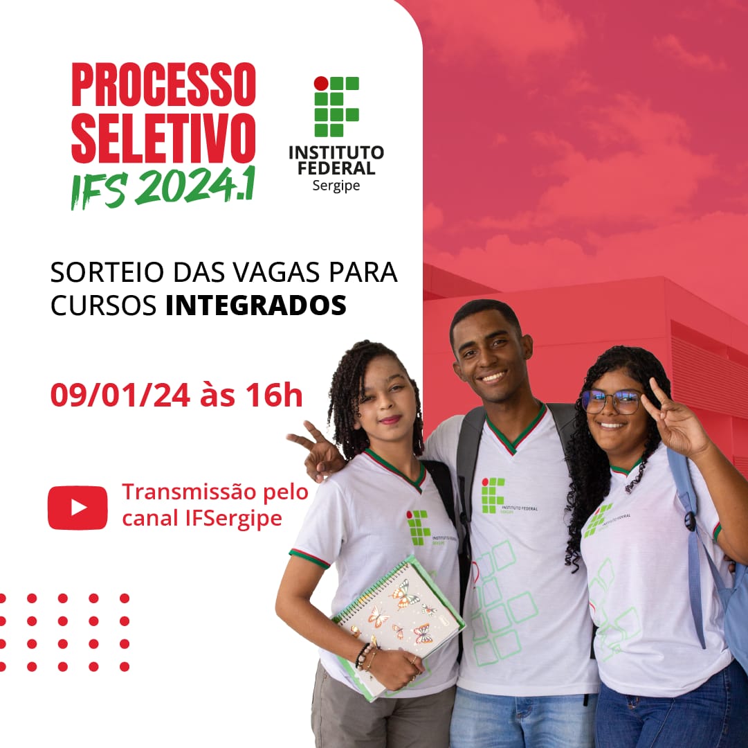 Acontece na próxima terça, 09, o sorteio eletrônico do Processo Seletivo 2024.1 do Instituto Federal de Sergipe (IFS), destinado à seleção de candidatos dos cursos técnicos de nível médio na forma integrada. O sorteio ocorrerá a partir das 16h, no canal oficial do IFS no YouTube, tendo a participação de no mínimo três servidores da instituição.
