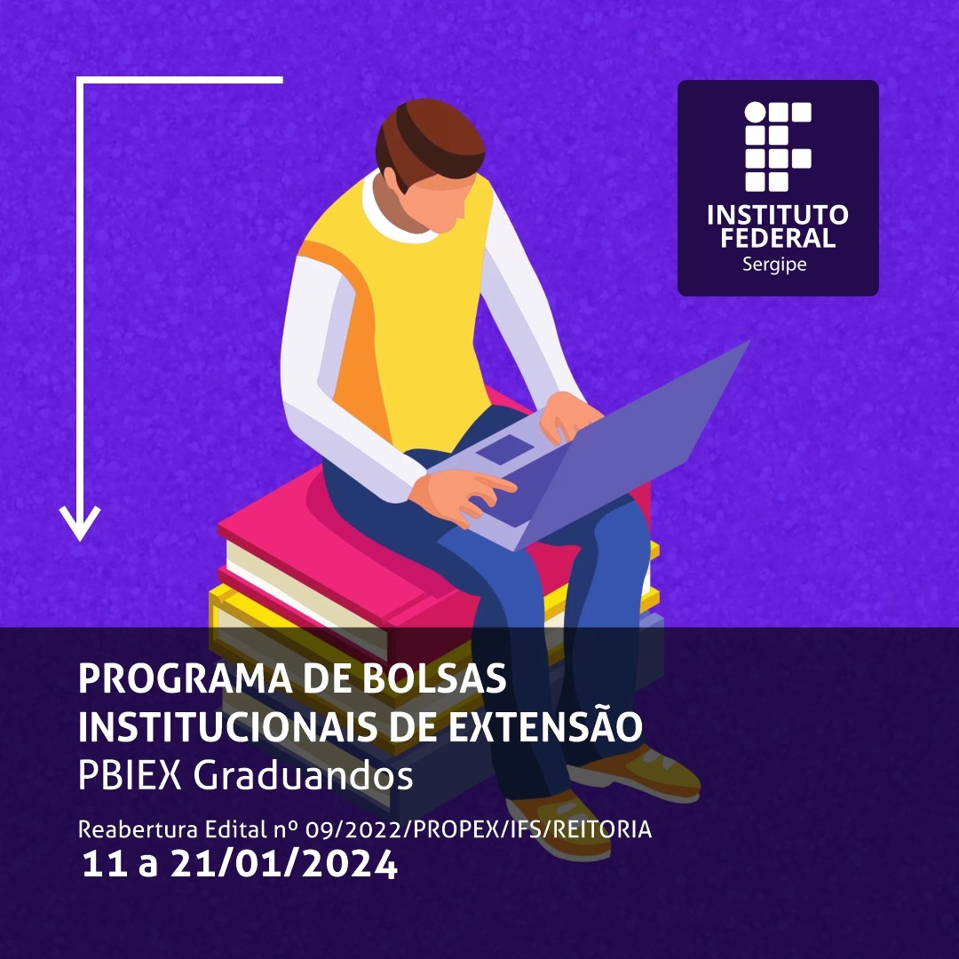 O Instituto Federal de Sergipe (IFS), através da Pró-reitoria de Pesquisa e Extensão, torna pública a reabertura do edital nº 09/2022 (Programa de Bolsas Institucionais de Extensão – PBIEX), voltado ao preenchimento de vagas com bolsas para graduandos de áreas como: Audiovisual/Vídeo Maker, Direito, Letras Português e Inglês, Administração, Secretariado, Teatro, Design Gráfico, dentre outras.