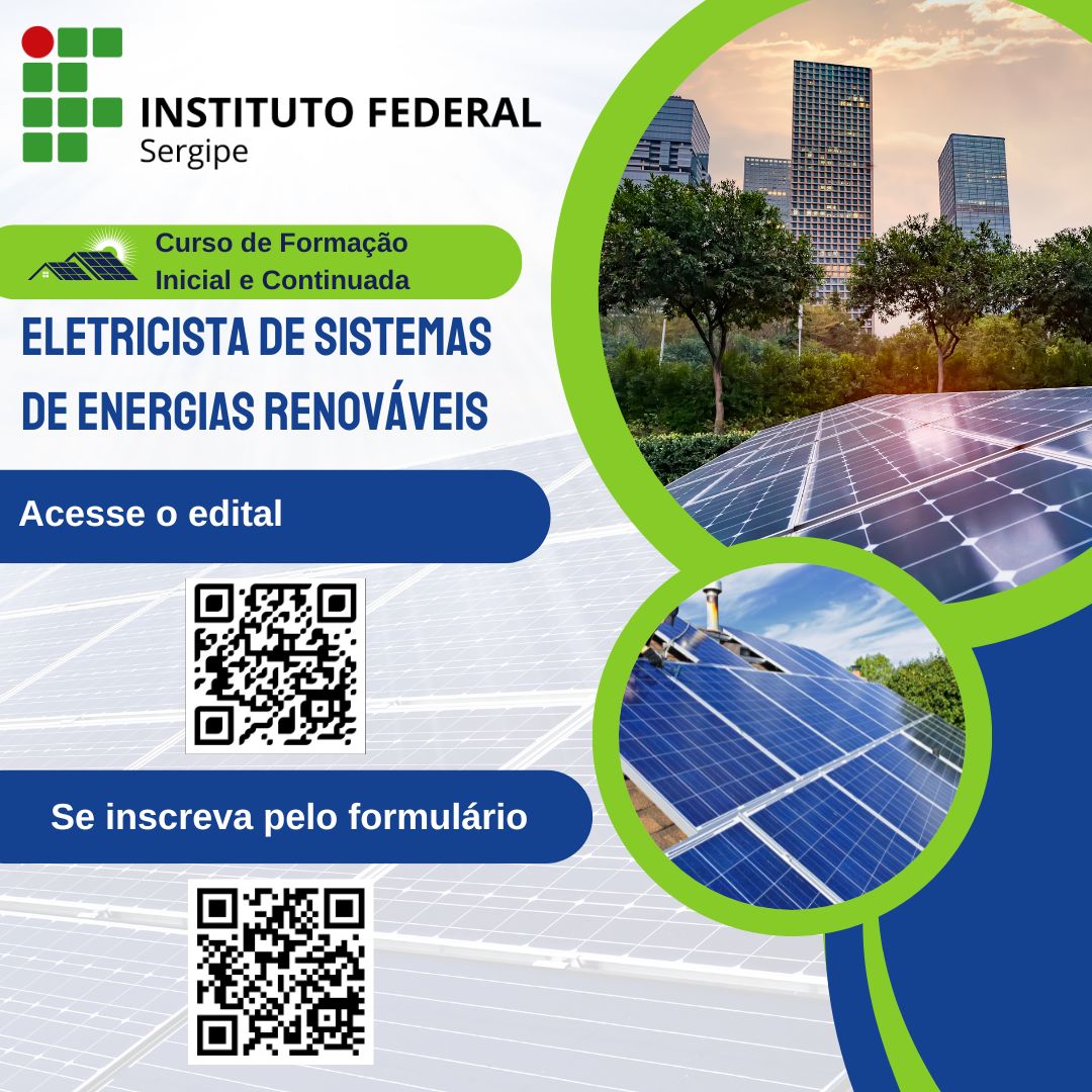 Em continuidade ao Processo Seletivo 2024.1, o Instituto Federal de Sergipe está com inscrições abertas para o curso de Eletricista de Sistemas de Energias Renováveis. São ofertadas 80 vagas e os interessados devem se inscrever até a próxima quarta-feira (22), por meio de formulário on-line.