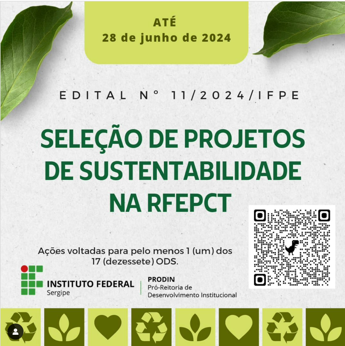A Rede Federal de Educação Profissional e Tecnológica está selecionando projetos de sustentabilidade desenvolvidos pelas instituições integrantes, entre elas o Instituto Federal de Sergipe, por meio da chamada pública REI/IFPE Nº 11, de 27 de março de 2024. O eixo estruturante das ações estar voltadas para pelo menos um dos 17 Objetivos do Desenvolvimento Sustentável (ODS), e podem ser selecionadas para serem apresentadas nos eventos preparatórios e na 30ª Conferência das Partes (COP30).