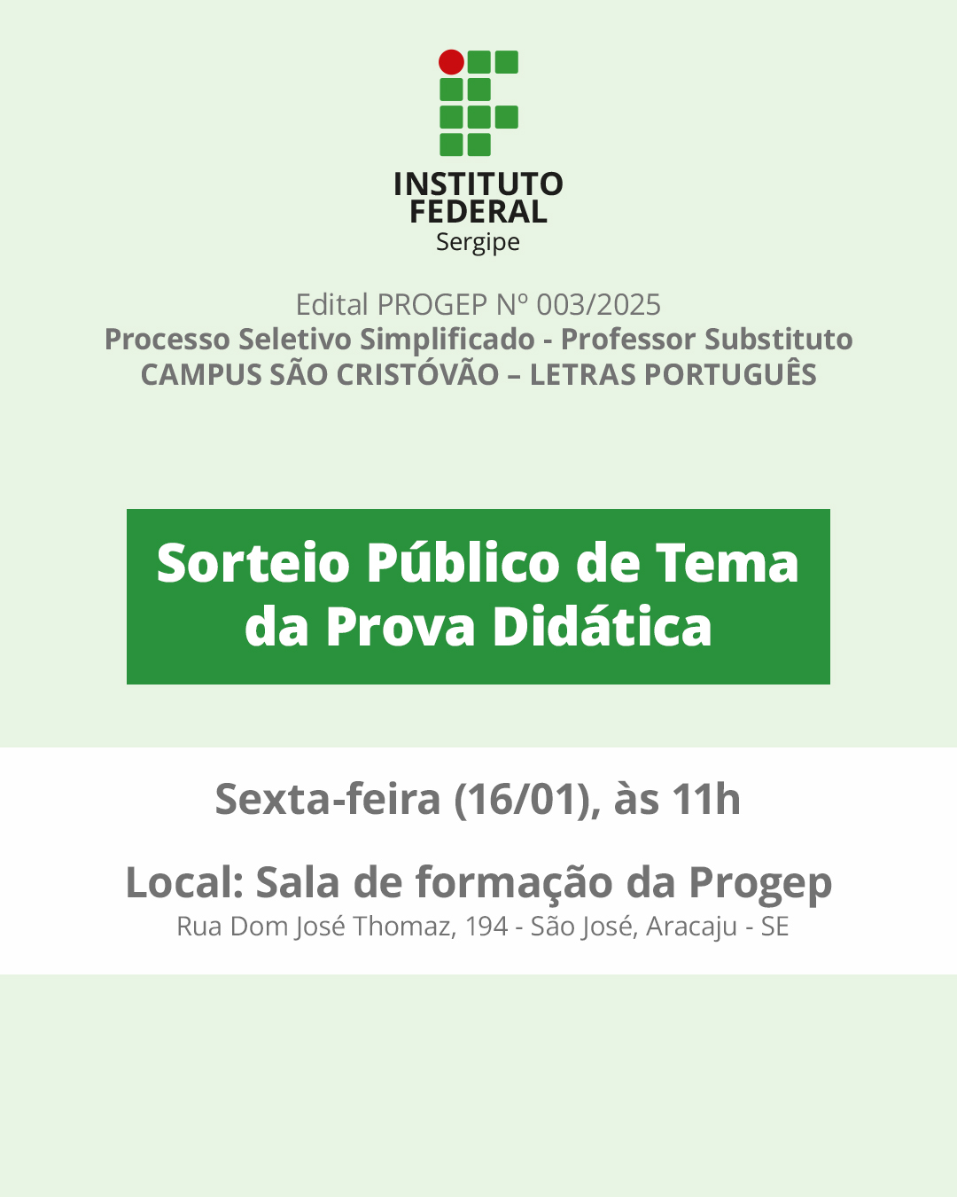 O Instituto Federal de Sergipe (IFS), por meio da Pró-Reitoria de Gestão de Pessoas (Progep), realizará nesta sexta-feira, 16, às 11h, o sorteio público do tema da Prova Didática referente ao Processo Seletivo Simplificado (PSS) para contratação temporária de Professor Substituto na área de Letras – Português.