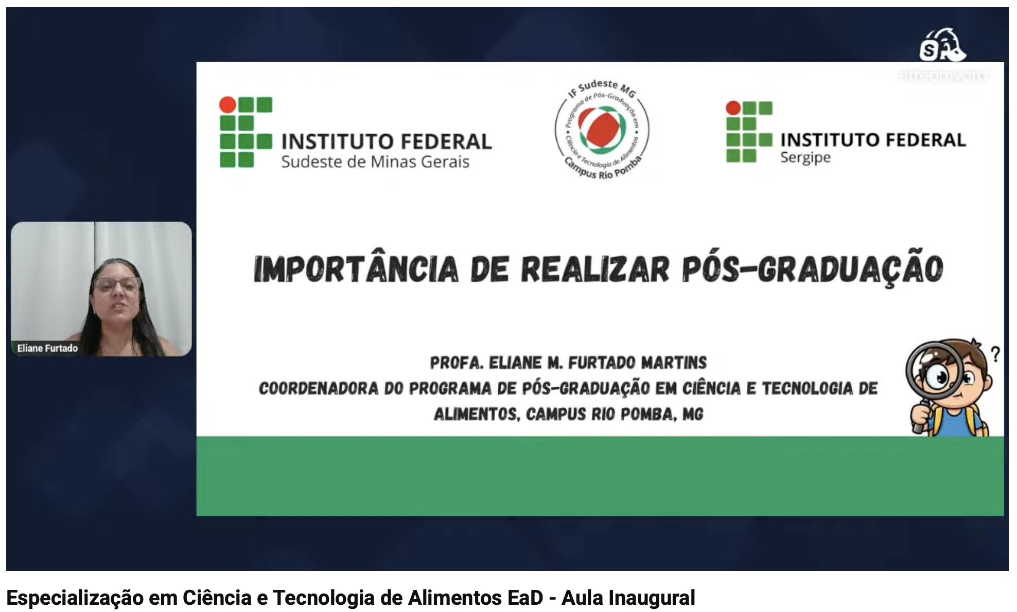 O Instituto Federal de Sergipe realizou, no dia 8 de abril, às 19h, a aula inaugural do curso de Especialização Lato Sensu em Ciência e Tecnologia de Alimentos na modalidade a distância (EaD). O evento foi transmitido ao vivo pelo YouTube e marcou o início das atividades acadêmicas da primeira turma do curso.