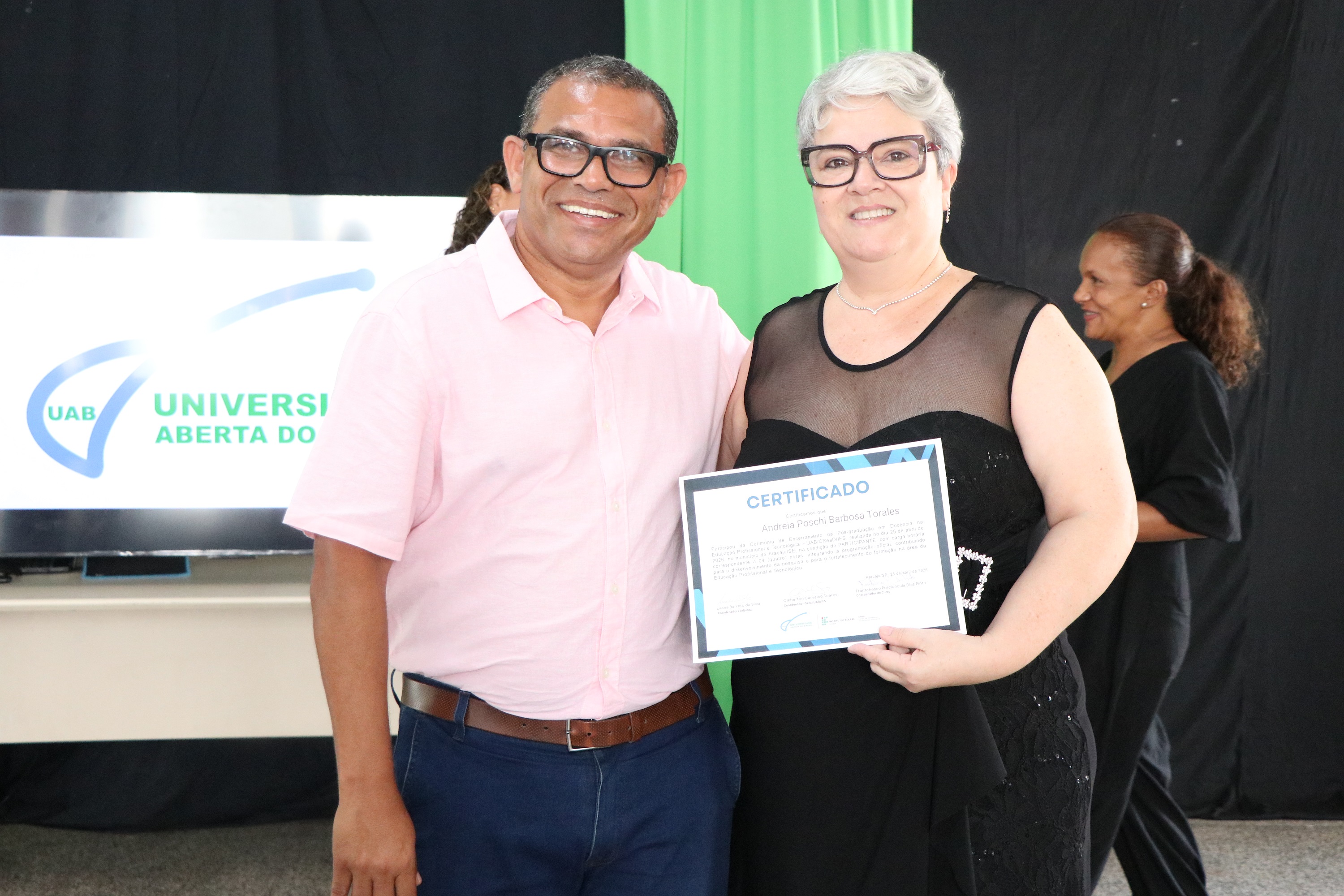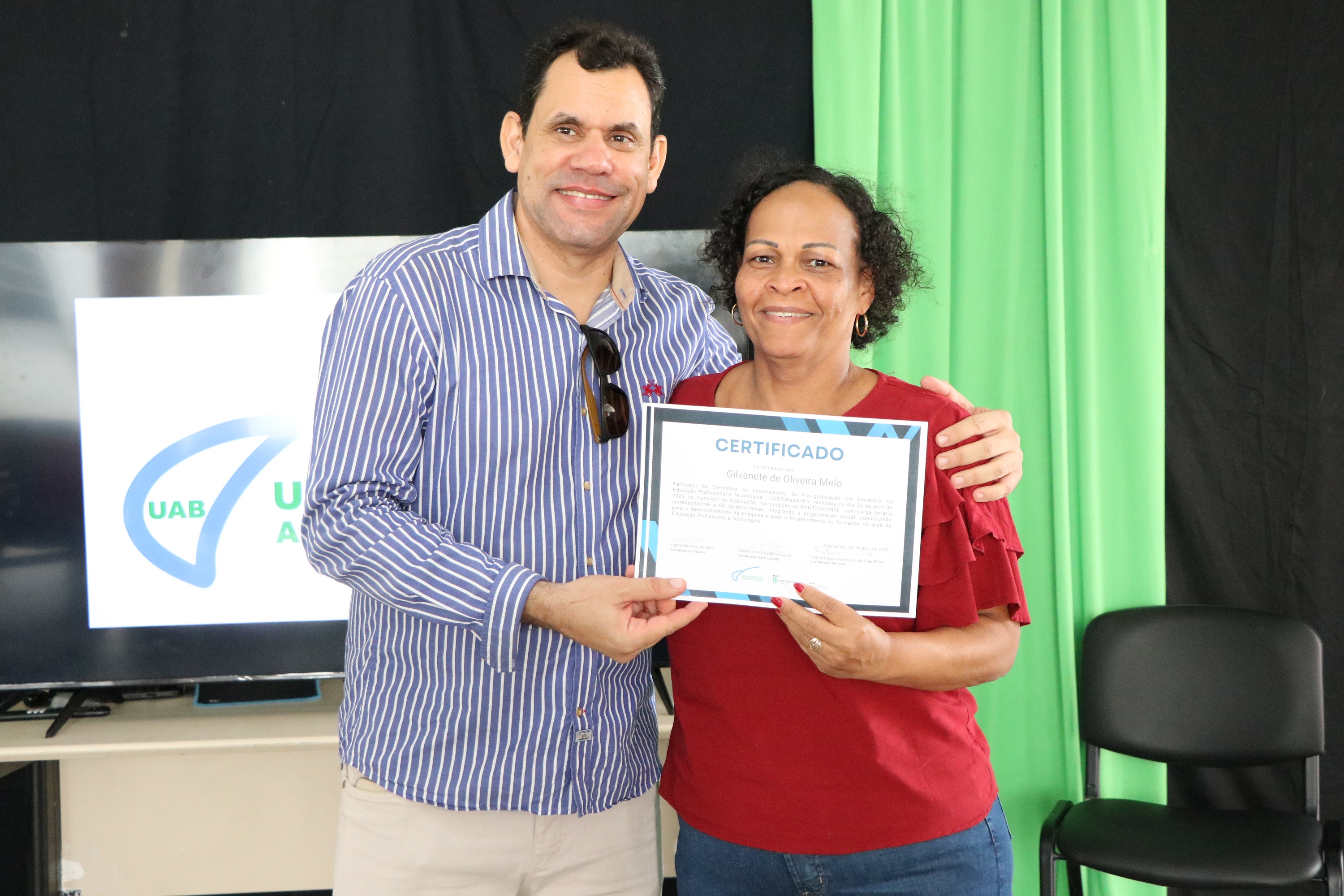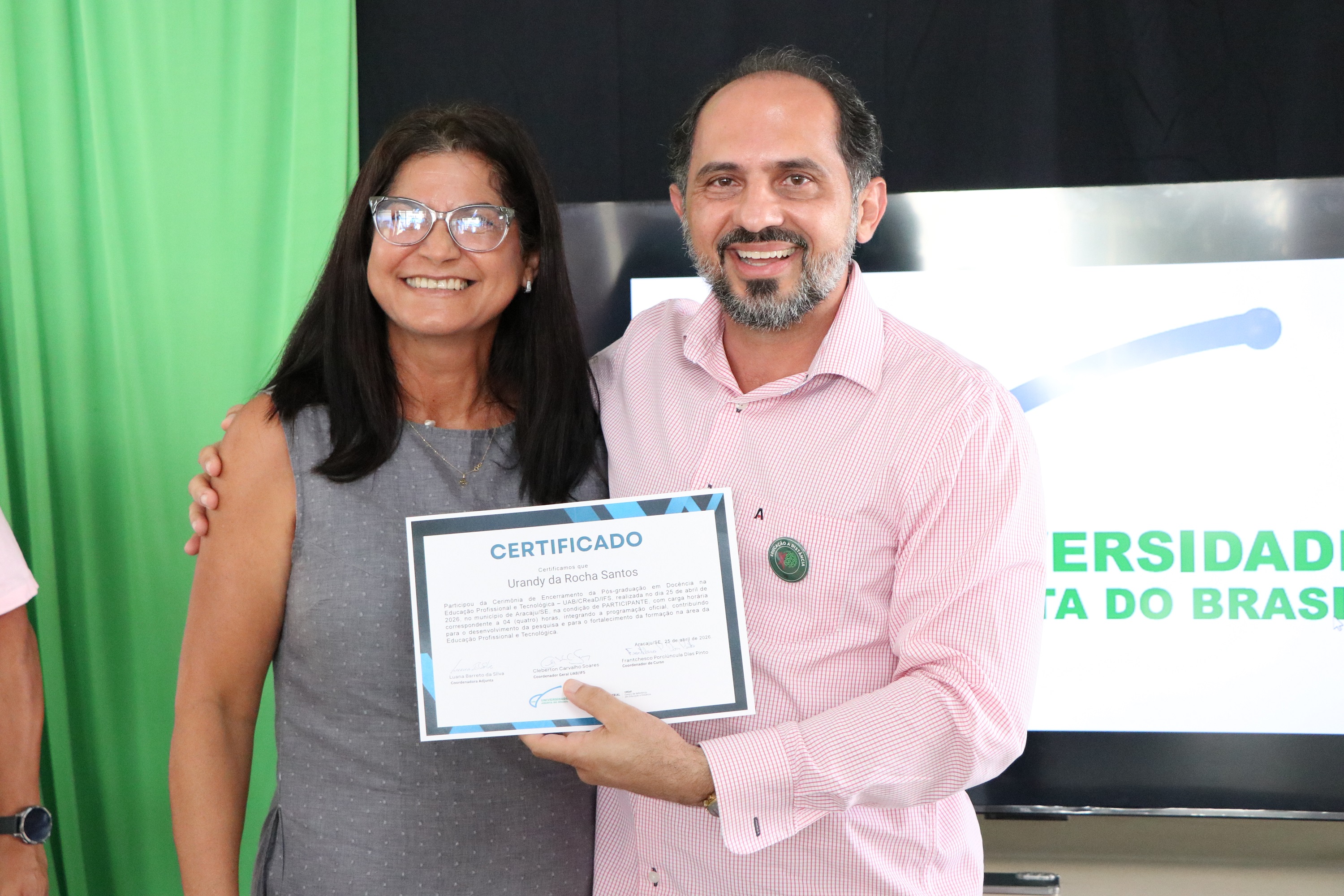 Confira na galeria abaixo outras fotos da formatura, que contou com a participação do professor José Osman dos Santos, pró-reitor de Pesquisa e Extensão; da representante dos polos UAB em Sergipe, Urandy Rocha dos Santos; do coordenador geral da UAB, professor Cleberton Soares; da coordenadora adjunta da UAB, Luana Barreto; da professora Valéria Oliveira, chefe titular do CREaD/IFS; e dos professores Sônia Melo e Jairton Mendonça, diretores-gerais dos campi Estância e Itabaiana, respectivamente.