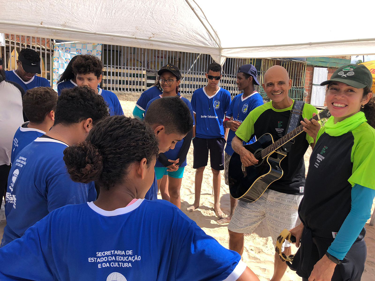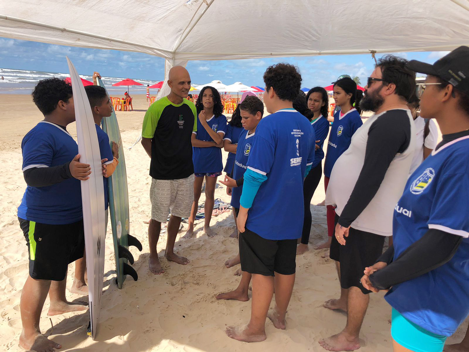 Não é novidade que a disciplina matemática assusta alguns estudantes. Mas não precisa ser assim! Acadêmicos do curso de Licenciatura em Matemática do Instituto Federal de Sergipe, campus Aracaju, provam que é possível aprender a matéria de maneira divertida, trocando sala por aula na praia, lápis e papel por prancha. Na manhã do último sábado (6), 20 alunos do 8º e 9º ano do ensino fundamental do Colégio Estadual João Batista Nascimento, localizado no município de Nossa Senhora do Socorro, região metropolitana de Aracaju, participaram de uma experiência pedagógica inédita com os estudantes do IFS.