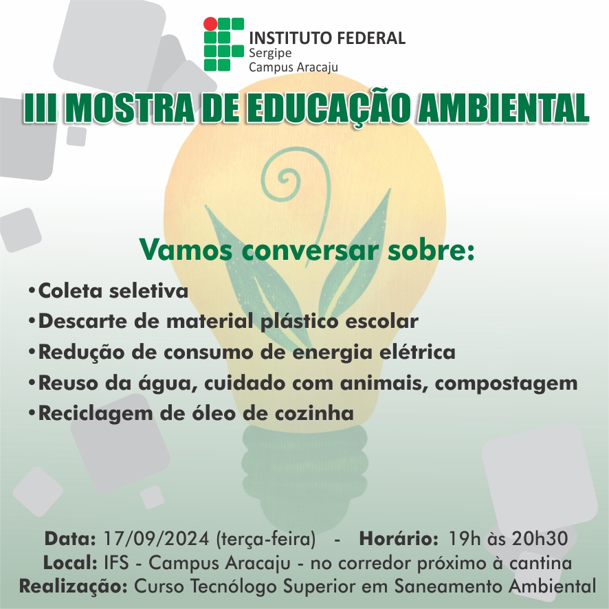 A III Mostra de Educação Ambiental será realizada em 17 de setembro, terça-feira, das 19h às 20h30, como resultado das práticas pedagógicas adotadas na disciplina Educação Ambiental e Cidadania, ministrada pela professora Flávia Dantas Moreira, no curso Tecnologia em Saneamento Ambiental, do IFS campus Aracaju. O evento ocorrerá no corredor entre a área de convivência e cantina do campus.