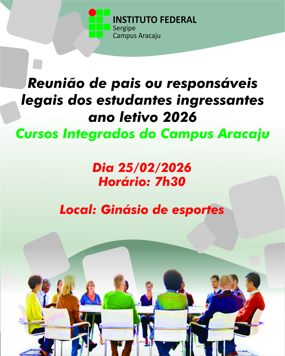 O campus Aracaju do Instituto Federal de Sergipe (IFS) realizará na próxima quarta-feira (25), a partir das 7h30, no ginásio de esportes da unidade, a primeira reunião de pais ou responsáveis legais dos estudantes ingressantes nos cursos técnicos integrados ao ensino médio para o ano letivo de 2026.