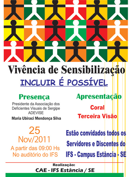 Na próxima sexta-feira, 25, a partir das 9h, o Instituto Federal de Sergipe (IFS) - Campus Estância, através da Coordenação de Assistência Estudantil (CAE), promove a vivência de sensibilização ‘Incluir é possível’. Durante o evento, que acontece no auditório do campus, serão realizadas atividades voltadas às necessidades educacionais especiais.