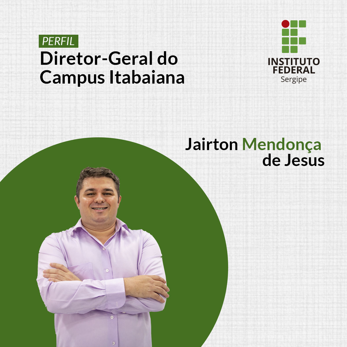 Jairton Mendonça de Jesus tem 42 anos, é licenciado em Letras Português, bacharel em Direito, especialista em Ensino de Português e Literatura, mestre em Letras e doutor em Educação, todos pela Universidade Federal de Sergipe (UFS). No IFS, já exerceu a função de supervisor de curso pelo Pronatec e também foi presidente em diversas comissões relevantes. Jairton é professor da área de Língua Portuguesa desde 2011 e também exerce o cargo de Gerente de Ensino do Campus Itabaiana desde setembro de 2018. Ele foi eleito com 53,85% dos votos e tomou posse pela primeira vez como diretor, no dia 31 de outubro.