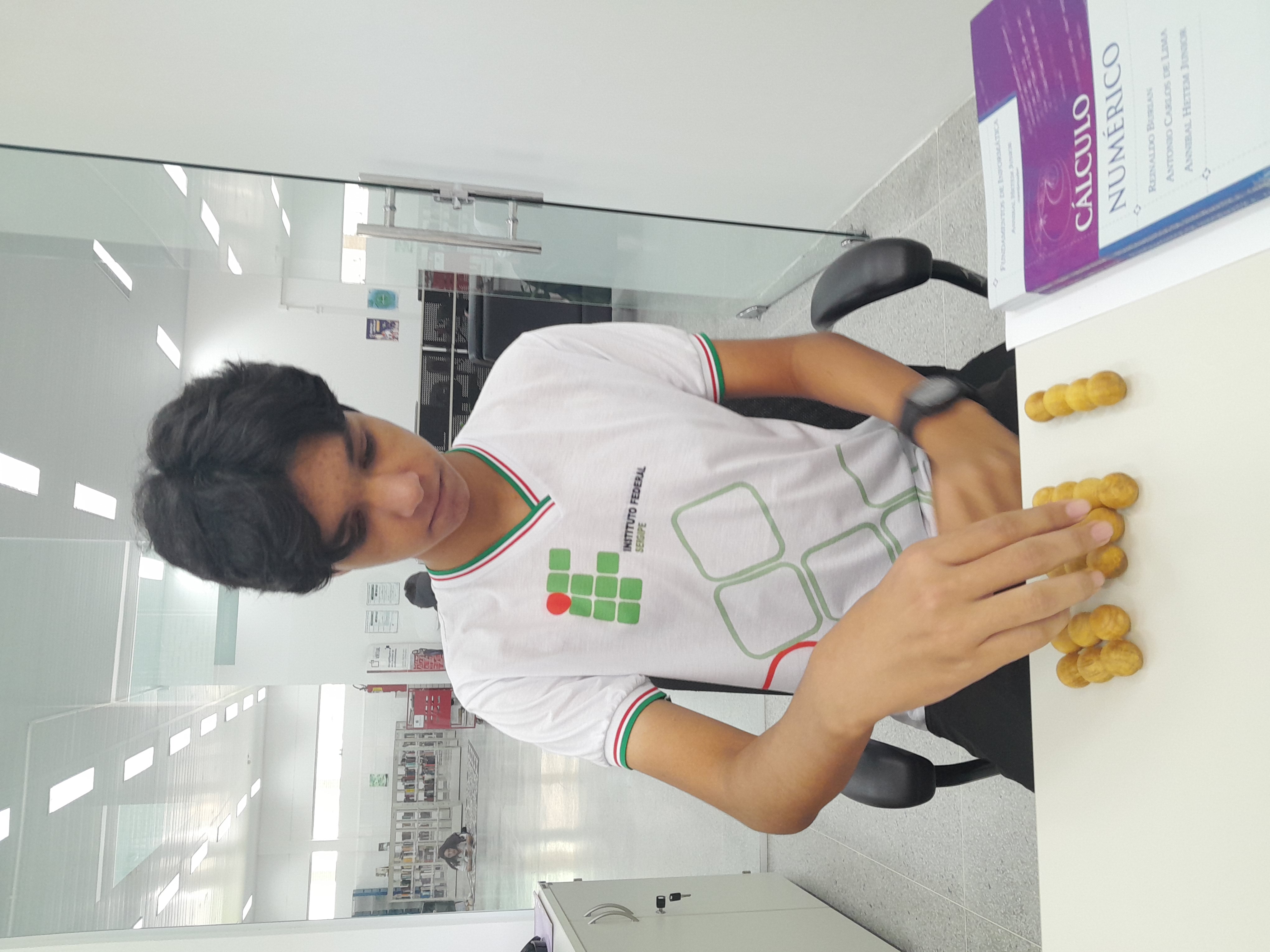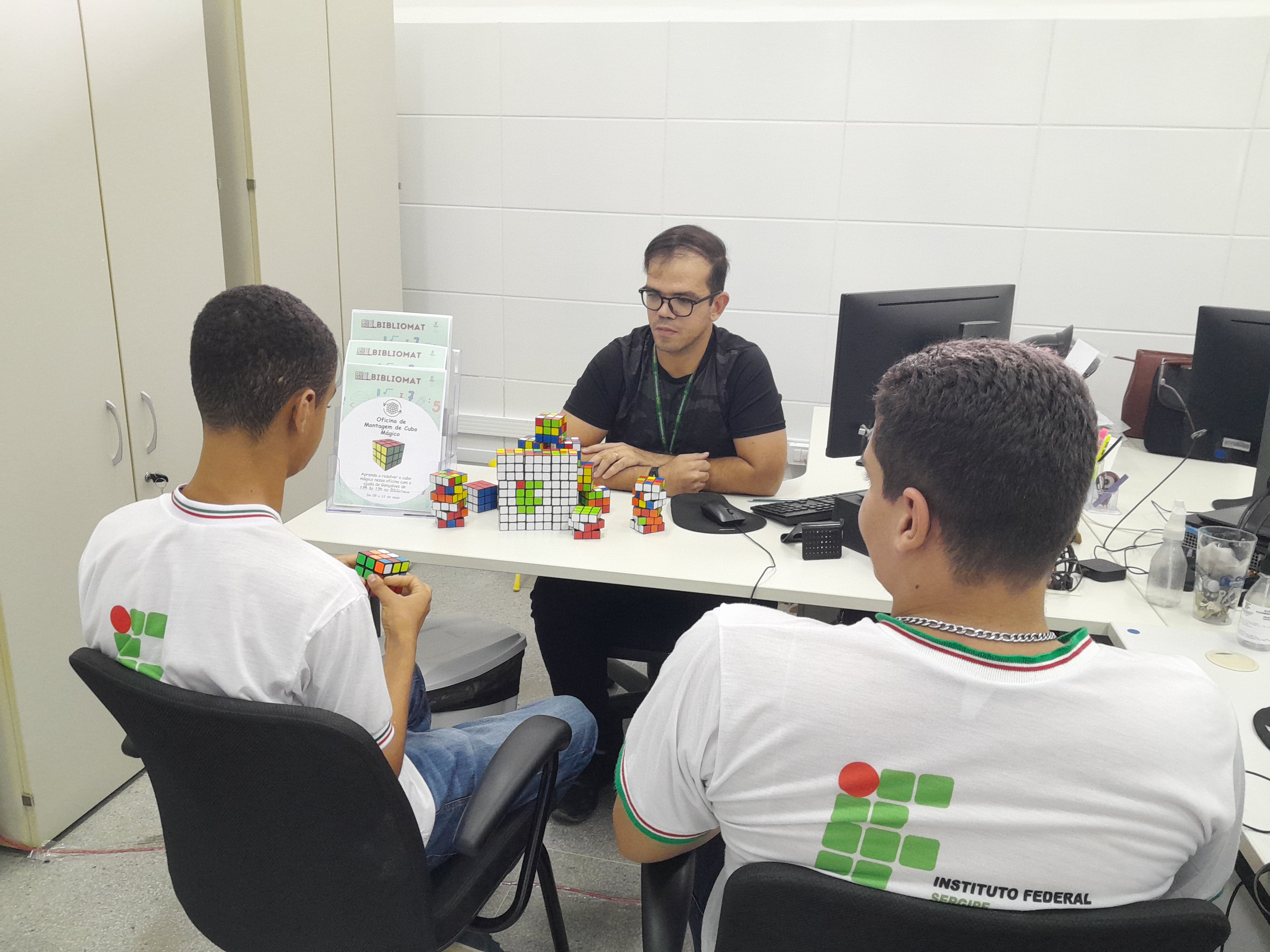 Geometria com JujubasO evento contou com oficinas de jogos de raciocínio, como o cubo mágico e adaptações de jogos populares africanos que fazem parte do acervo da Ludoteca, um projeto mantido pela biblioteca. Nesta ação, Gonçalves interagiu diariamente com os estudantes, ensinando sobre o algoritmo de resolução do jogo. Os alunos exploraram intuitivamente conteúdos da Geometria e uso de raciocínio lógico. O público recebeu tão bem as atividades, que houve a necessidade de estender o tempo de duração das oficinas. Para o estudante Artur da Silva Santos, calouro do curso integrado em Manutenção e Suporte em Informática - MSI, a Matemática se trata de um código, “então, conseguindo entender a solução do cubo mágico, fica fácil entender outros assuntos da Geometria”. Já Luiz Felipe dos Santos Bispo, iniciante do mesmo curso, comemorou os avanços durante as oficinas. “No [jogo] da Pirâmide, eu passei 19 minutos tentando resolver, mas deu o horário da aula e devolvi o jogo; no outro dia, peguei mais uma vez, e consegui concluir em 5 minutos”.