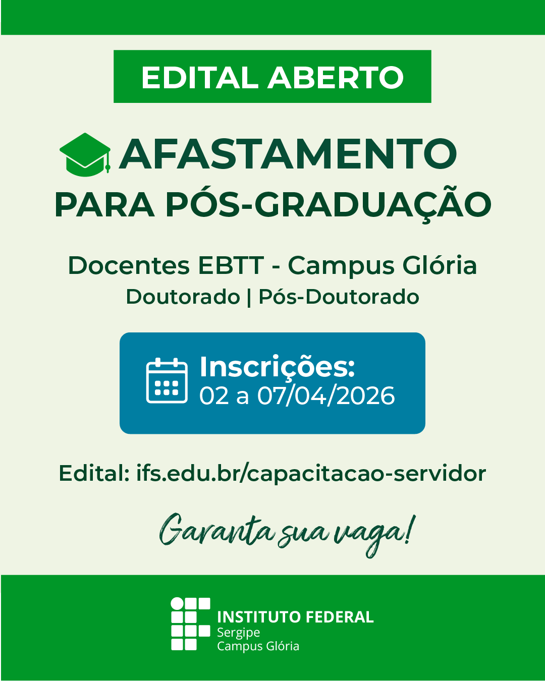 O Instituto Federal de Sergipe (IFS) abriu seleção para concessão de afastamento integral a docentes do Campus Glória interessados em cursar pós-graduação stricto sensu no semestre 2026.1. O edital prevê duas vagas, uma para doutorado e outra para pós-doutorado, e as inscrições devem ser feitas entre os dias 2 e 7 de abril, por e-mail. O resultado final está previsto para 29 de abril, e os selecionados terão até 45 dias após essa data para formalizar o pedido de afastamento.