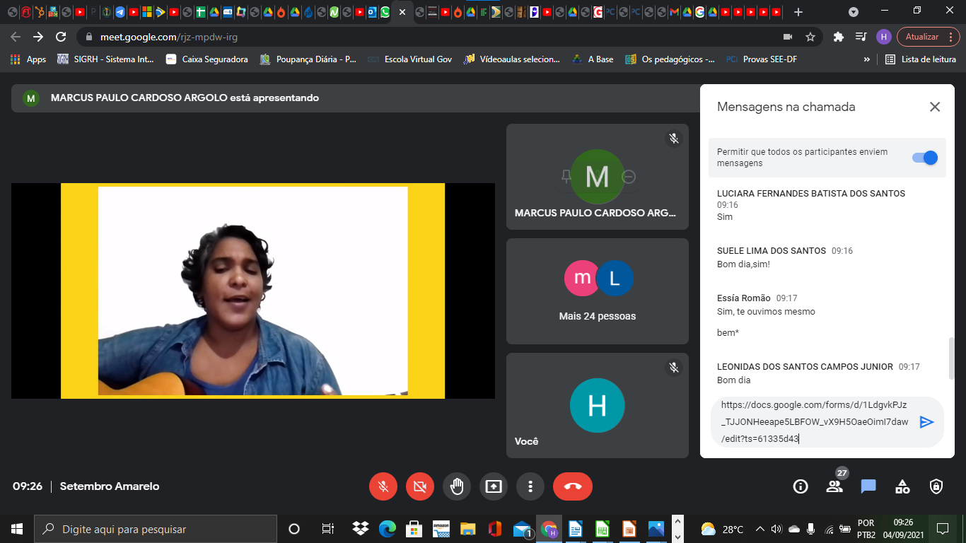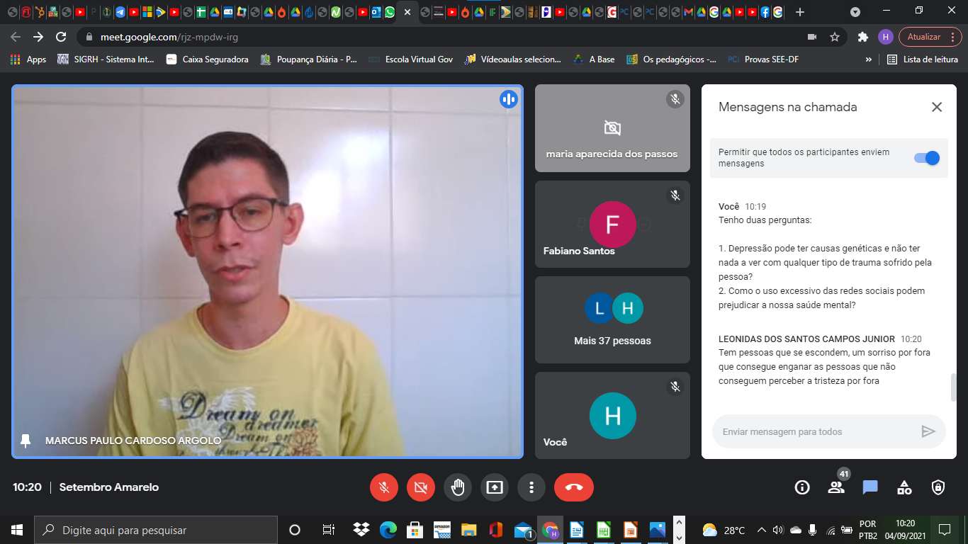 RoniseComo parte das ações de conscientização da Campanha do Setembro Amarelo, discentes e servidores do Campus Glória participaram da roda de conversa “Saúde Mental na Juventude”, realizada pela plataforma Google Meet e que teve como convidados os psicólogos clínicos Fabiano Lima e Jameson Pereira Silva.