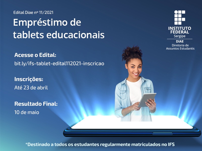 O Instituto Federal de Sergipe (IFS), através da Diretoria de Assuntos Estudantis (DIAE), torna público o edital nº 11/2021 de concessão de empréstimo dos chamados tablets educacionais. As inscrições deverão ser realizadas até o dia 23 de abril, através do link: bit.ly/ifs-tablet-edital112021-inscricao. Os equipamentos tecnológicos são uma ferramenta para o processo de inclusão digital de estudantes, diante do Ensino Remoto estabelecido pela pandemia de Covid-19.