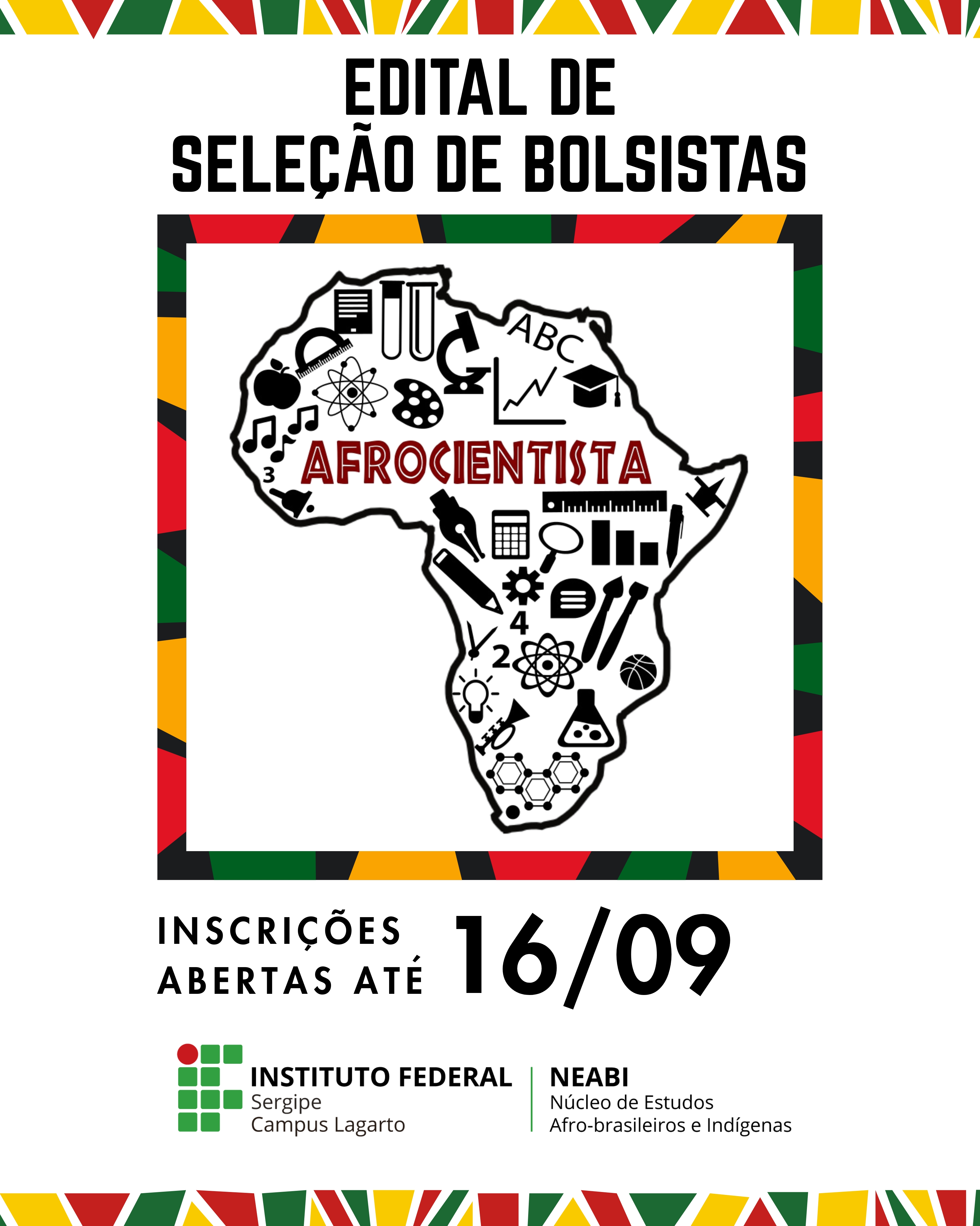 O Núcleo de Estudos Afro-Brasileiros e Indígenas (NEABI) do Instituto Federal de Sergipe (IFS) - Campus Lagarto tem a satisfação de anunciar a abertura de processo seletivo para a concessão de bolsas de estudo para o projeto de pesquisa “Etnomatemática em Ofícios”. A iniciativa, que integra a sexta edição do Projeto Afrocientista, visa fortalecer a trajetória acadêmica e científica de estudantes negros(as) e quilombolas dos níveis médio e superior.
