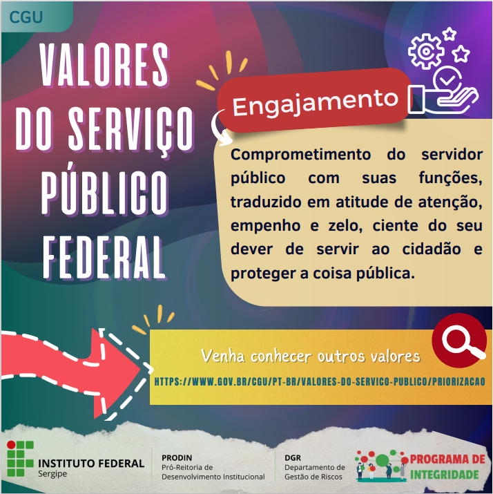 Engajamento, integridade, imparcialidade, gentileza, justiça , profissionalismo e vocação pública foram os Valores escolhidos com base em pesquisa feita com servidores públicos federais.