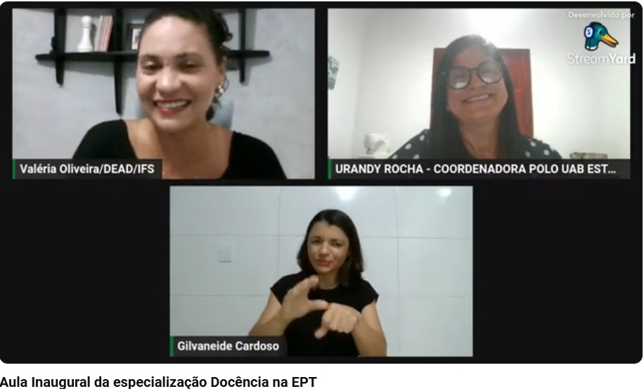 Na última quinta-feira, 31 de outubro, o Departamento de Educação a Distância (DEAD) do Instituto Federal de Sergipe deu início ao curso de especialização em Docência na Educação Profissional e Tecnológica (EPT). A aula inaugural, transmitida ao vivo pelo canal do IFS no YouTube, contou com a participação do Pró-Reitor de Ensino, Alysson Barreto, o coordenador do curso, Adriano de Souza, equipe do DEAD, bolsistas do programa Universidade Aberta do Brasil (UAB) e coordenadores de polo.