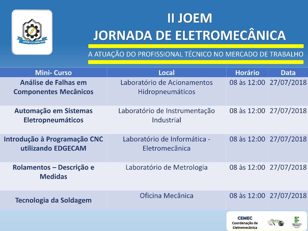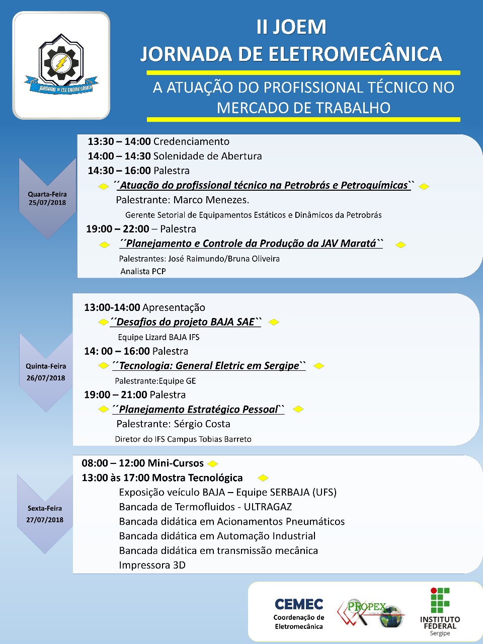 Nos dias 25, 26 e 27, o curso técnico em Eletromecânica realizará palestras, minicursos e debates com representantes de empresas que absorvem profissionais no mercado sergipano