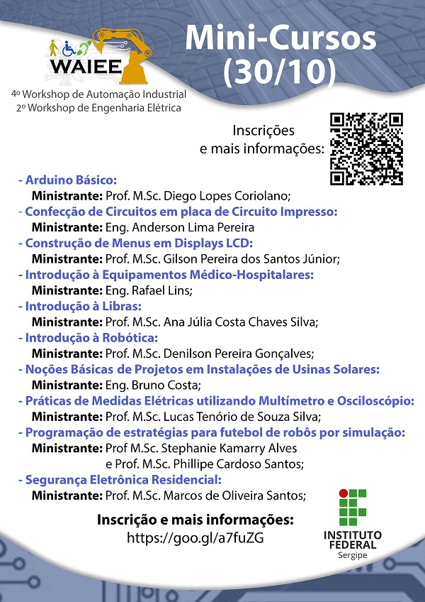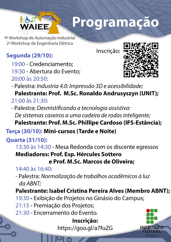 Estão abertas as inscrições para o 4º Workshop de Automação Industrial e 2º Workshop de Engenharia Elétrica do IFS - Campus Lagarto. O evento, que já se tornou uma marca do calendário acadêmico da instituição, terá como tema central a aplicação de tecnologias à acessibilidade.