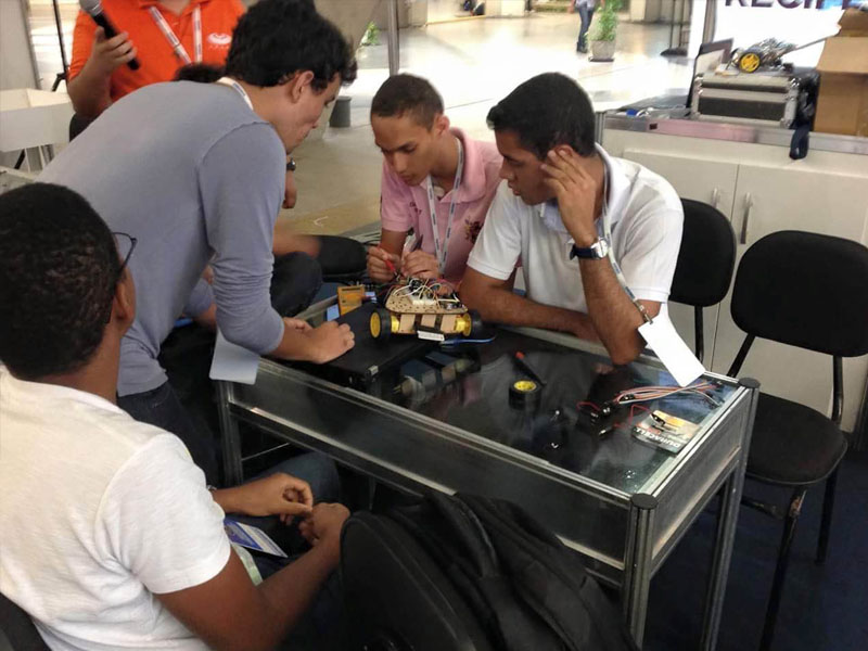 Os estudantes Daniel Melo (3IELN), Ícaro Santana (3IELN), Gabriel Marques (4IELN), Davi Alves (4IELN) e Welerson Melo (4IELN), alunos dos cursos técnicos integrado em Eletrônica e Informática do Instituto Federal de Sergipe (IFS), Campus Aracaju, conquistaram a 1ª colocação na I Oficina de Robótica, realizada no XXXV Congresso da Sociedade Brasileira de Computação, nos dias 21 e 22 de julho, em Recife. Os estudantes, que são vinculados ao convênio IFS/ Petrobrás, superaram graduandos e pós-graduandos, e foram os únicos que completaram com sucesso o desafio.A oficina, uma das atividades do congresso organizado pela CIn/UFPE, teve como objetivo promover e incentivar a troca de experiências entre as comunidades científica, acadêmica e profissionais da computação. "Nosso objetivo era fazer com que os participantes colocassem a mão na massa e desmistificassem ideias pré-concebidas sobre a robótica, além de contribuir para o desenvolvimento da internet das coisas e sua atuação na sociedade. Mostramos que era possível desenvolver robôs em benefício da sociedade e que podem ser utilizados no dia a dia das pessoas", diz César França, coordenador da oficina e pesquisador do CESAR (Centro de Estudos e Sistemas Avançados do Recife).