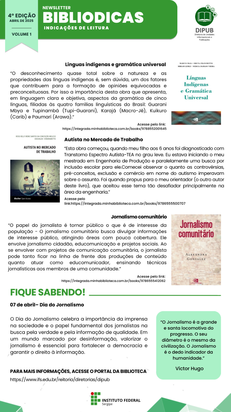 O bibliodicas é um projeto da DIPUB que tem como propósito aproximar a comunidade acadêmica dos acervos virtuais disponibilizados pelas bibliotecas do IFS. Boa leitura e um feliz início de ano!