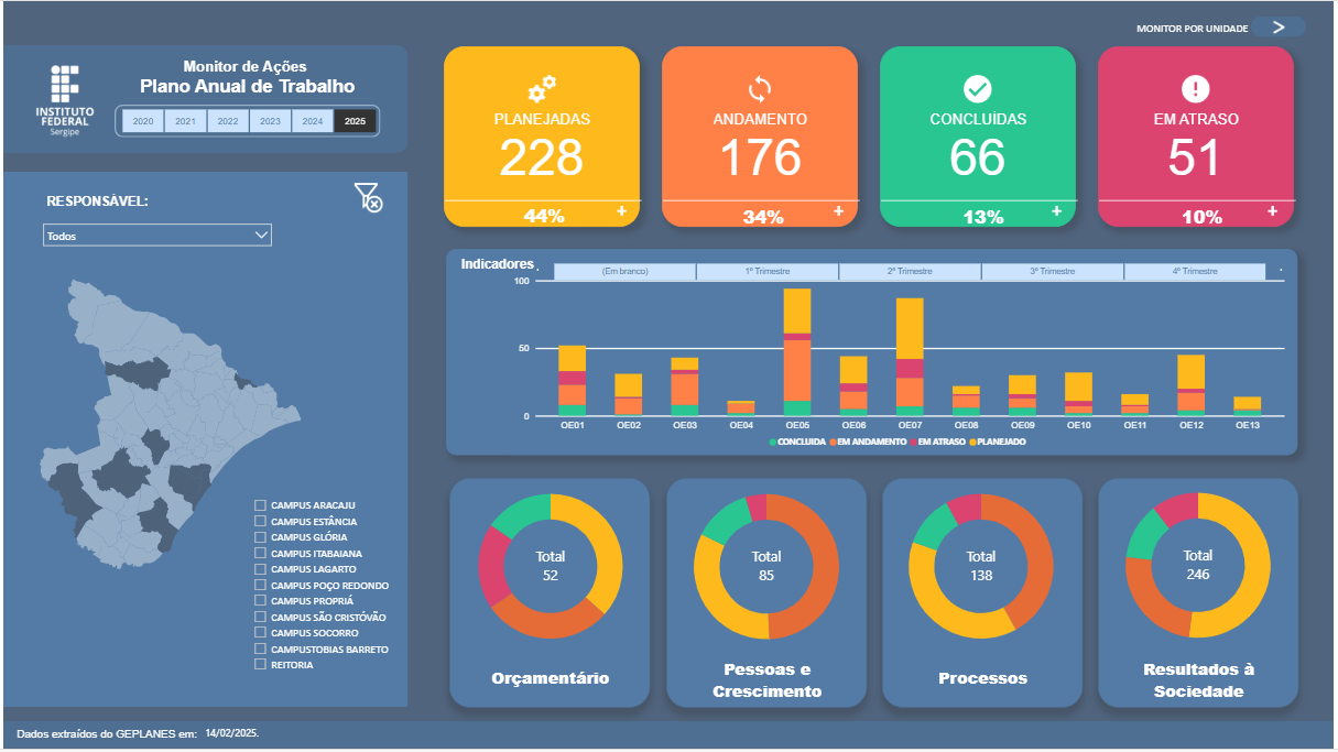 O Plano Anual de Trabalho (PAT) corresponde ao documento que formaliza o planejamento anual do IFS, para tanto, deve ser elaborado de forma articulada pelas Pró-Reitorias, Diretorias e os Campi, considerando suas estruturas hierárquicas e particularidades estratégicas.