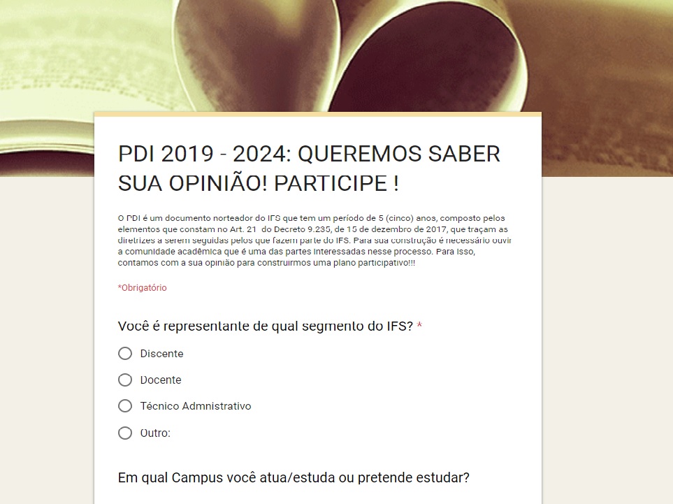 A Consulta Pública ficará disponível no período de 19 a 30 de agosto, podendo ser acessada pelo Formulário eletrônico: https://forms.gle/xRd9iqnpZ9yfqTJ49 . Alunos, Servidores e a comunidade externa podem contribuir na construção do documento, que prevê o planejamento do IFS para o período de 5 (cinco) anos.