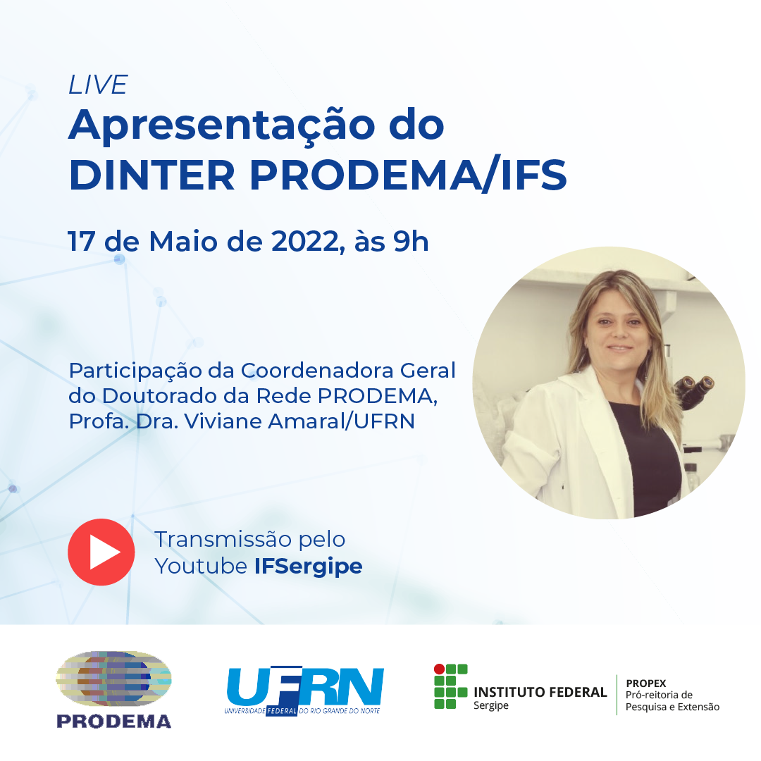 Na próxima terça, 17, toda a comunidade do IFS está convidada para participar, no canal oficial do IFS no YouTube, a partir das 9h, de uma live de apresentação do Doutorado Interinstitucional do Prodema, contando com a participação da coordenadora-geral do Doutorado da Rede, Viviane Amaral, da UFRN e toda a equipe de Pesquisa da Propex.