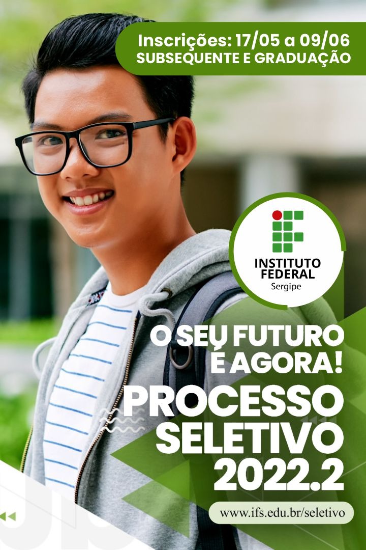 O Instituto Federal de Sergipe (IFS) abre inscrições a partir desta terça, 17, para o Processo Seletivo 2022.2 destinado ao preenchimento de vagas em cursos de Graduação - ofertados pelos Campi Aracaju, Lagarto, São Cristóvão e Glória; e para os cursos Técnicos de Nível Médio na forma Subsequente - ofertados por todos os campi da instituição. O método de seleção de candidatos ocorrerá através de provas objetivas, e no caso de ingresso para cursos de graduação, ainda haverá uma redação.
