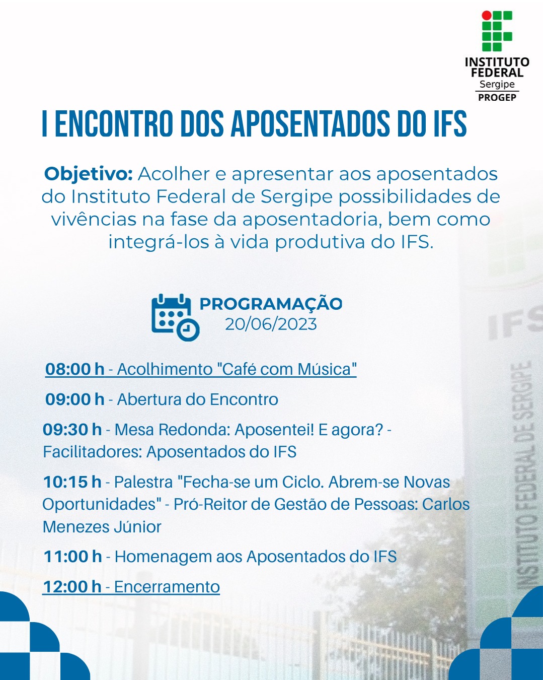 "Fecha-se um ciclo. Abrem-se novas oportunidades" é o tema escolhido pelo Instituto Federal de Sergipe para realização de seu I Encontro de Aposentados. O evento está marcado para a próxima terça-feira (20), em alusão ao dia do aposentado público, o qual é celebrado no Brasil em 17 de junho. Foram convidados, via telegrama ou contato telefônico, os servidores aposentados do IFS.
