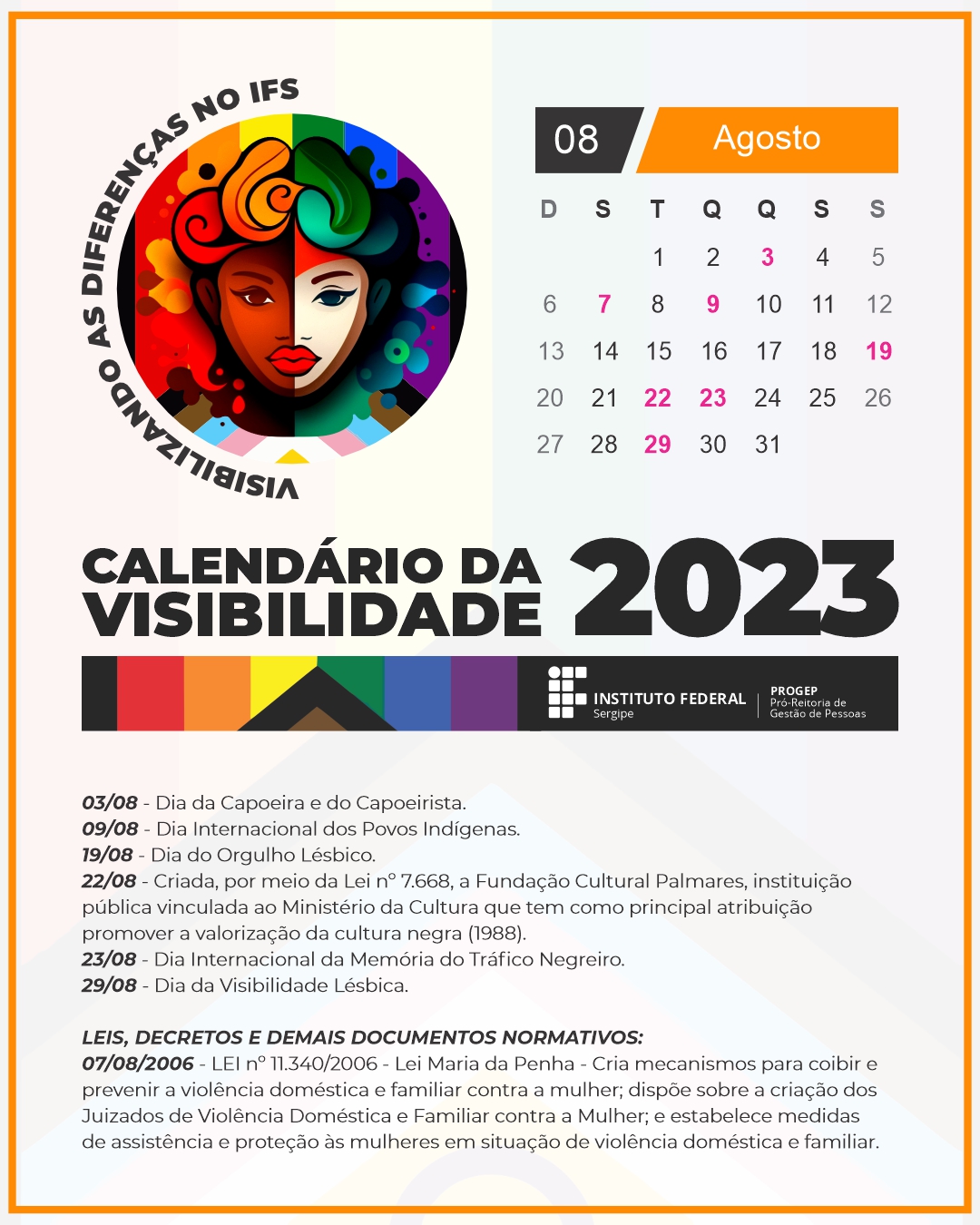 Mais um mês está se iniciando e, para a tristeza de muitos, agosto é conhecido por não possuir feriados nacionais. Mas, você sabia que o IFS está cheio de datas importantes neste mês? É hora de transformar o estereótipo do "mês do desgosto" em mês do orgulho! Trata-se do Calendário da Visibilidade, uma das ações propostas no projeto "Visibilizando as Diferenças no IFS", que traz uma agenda personalizada com datas alusivas à diversidade.