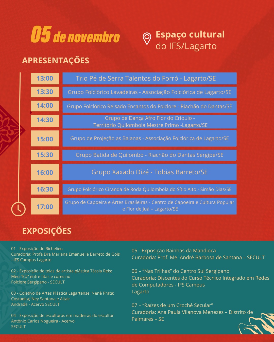 O Campus Lagarto do Instituto Federal de Sergipe convida toda a comunidade acadêmica e sociedade em geral para participar da 2ª edição do Festival do Patrimônio Material e Imaterial do Centro Sul Sergipano. Será nos dias 5 e 6 de novembro, no Espaço Cultural do campus, com programação envolvendo apresentações artísticas, exposições, além de simpósios temáticos que serão realizados presencialmente e on-line. Para participar, os interessados devem realizar sua inscrição via SisPubli.