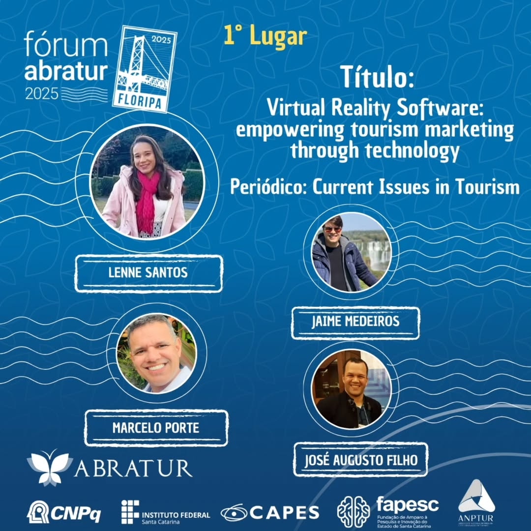 O Instituto Federal de Sergipe (IFS) foi destaque no Fórum ABRATUR 2025, da Academia Internacional para o Desenvolvimento da Pesquisa em Turismo no Brasil, realizado no Câmpus Florianópolis do Instituto Federal de Santa Catarina, ao conquistar o 1º lugar na premiação de melhor artigo publicado em periódico científico. O trabalho premiado, intitulado “Virtual Reality Software: empowering tourism marketing through technology”, foi desenvolvido no âmbito do Programa de Pós-Graduação em Turismo – Mestrado Profissional (PPMTUR) do IFS, com autoria principal da egressa Lenne Santos, sob orientação do professor Jaime José da Silveira Barros de Medeiros e coorientação do professor José Augusto Andrade Filho, ambos integrantes do corpo docente do programa.
